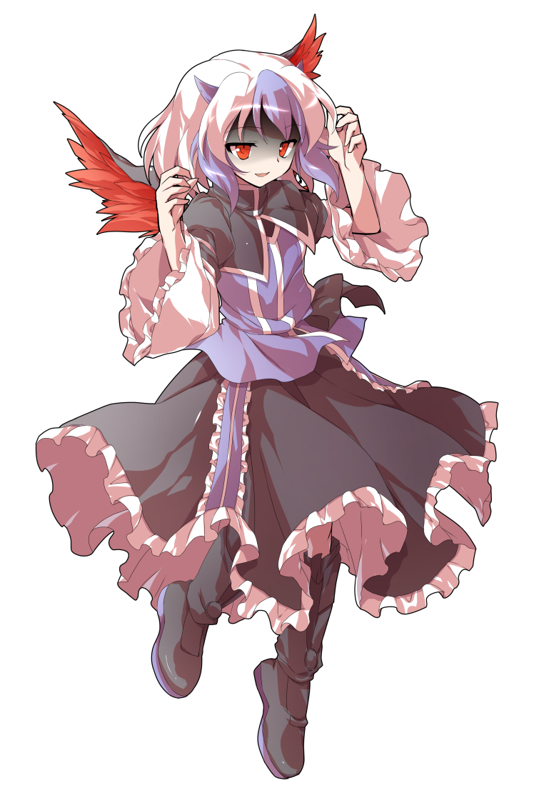 1girl alphes_(style) black_boots black_skirt blue_hair boots commentary_request dairi feathered_wings frilled_skirt frilled_sleeves frills full_body hands_up head_wings horns large_variant_set long_sleeves multicolored_hair parody parted_lips red_eyes red_wings shaded_face shirt short_hair single_head_wing skirt smile solo style_parody tachi-e tears tokiko_(touhou) touhou transparent_background two-tone_hair variant_set white_hair wide_sleeves wings