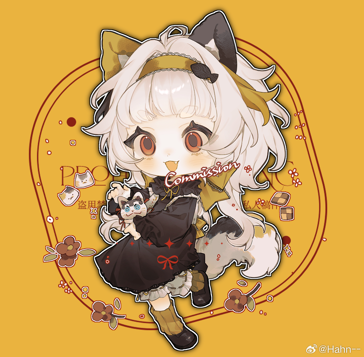 1girl ahoge animal_ears ankle_socks black_dress black_shoes bloomers blunt_bangs bow bow_choker cat_ears cat_girl cat_tail chibi chinese_commentary choker collared_dress commentary_request commission dress eyelashes fang fish_hair_ornament frilled_dress frilled_sleeves frills hahn_(weibo_5128615299) hair_intakes hair_ornament hairband happy highres holding holding_stuffed_toy lace-trimmed_bow lace-trimmed_hairband lace_trim leg_up light_blush long_hair long_sleeves looking_ahead medium_dress mismatched_animal_ear_colors multicolored_hair open_mouth original outline puffy_long_sleeves puffy_sleeves red_eyes ribbon ribbon-trimmed_bloomers ribbon_legwear ribbon_trim shoes sleeves_past_wrists smile socks solo standing streaked_hair striped_clothes striped_socks stuffed_animal stuffed_cat stuffed_toy tail underwear vertical-striped_clothes vertical-striped_socks very_long_hair watermark weibo_watermark white_bloomers white_hair white_outline yellow_background yellow_bow yellow_hairband yellow_ribbon yellow_socks