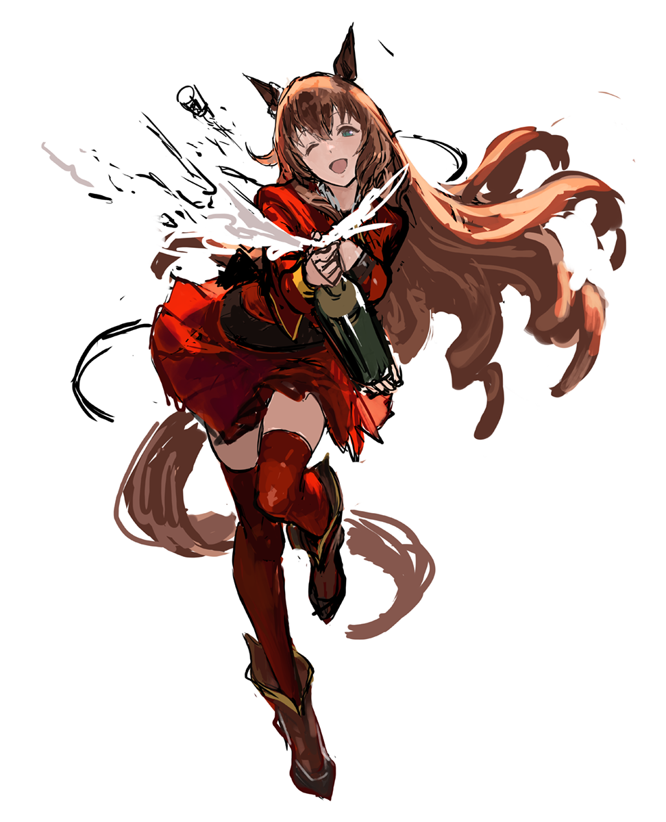 1girl animal_ears boots brown_hair curly_hair green_eyes highres long_hair maruzensky_(formula_r)_(umamusume) maruzensky_(umamusume) open_clothes open_mouth red_skirt red_socks rr_(suisse200) skirt socks umamusume white_background