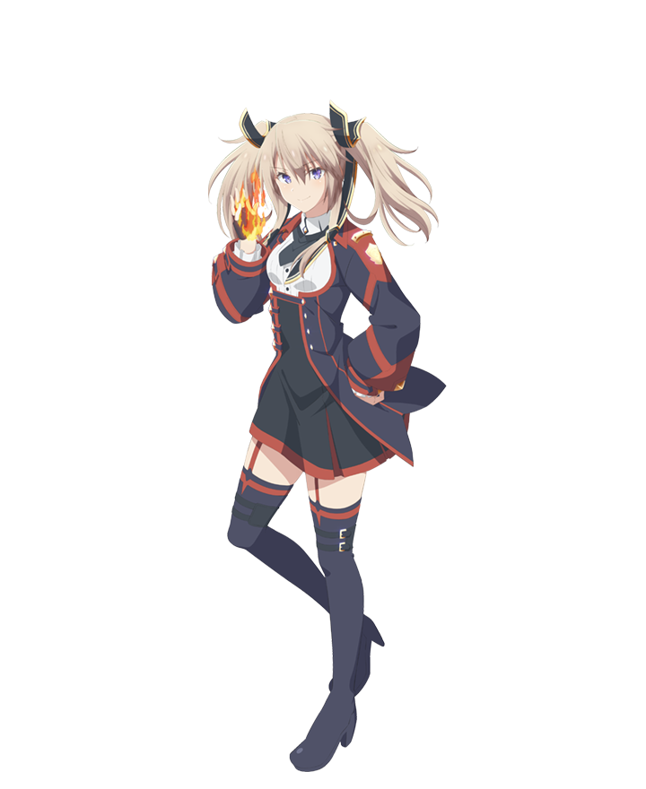1girl anime_coloring black_boots black_dress black_ribbon blonde_hair boots breasts demon_king_academy_school_uniform dress fire full_body garter_straps grey_hair hair_between_eyes hair_ribbon hand_on_own_hip long_hair long_sleeves looking_at_viewer maou_gakuin_no_futekigousha official_art purple_eyes ribbon sasha_necron school_uniform simple_background smile solo standing standing_on_one_leg thigh_boots thighhighs thighs transparent_background tsurime twintails yamayoshi_kazuyuki zettai_ryouiki
