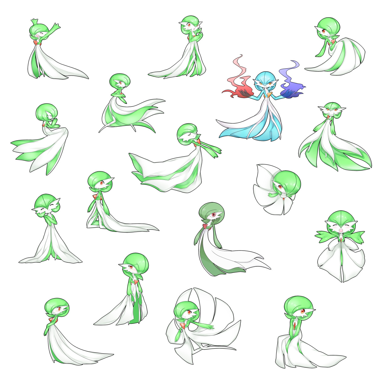 alternate_color bad_id bad_pixiv_id blue_hair blue_skin bob_cut closed_eyes colored_skin dress gardevoir gen_3_pokemon green_hair green_skin highres lotosu multicolored_skin multiple_views nintendo orange_eyes pink_eyes pokemon pokemon_(creature) shiny_and_normal shiny_pokemon simple_background two-tone_skin white_background white_dress white_skin