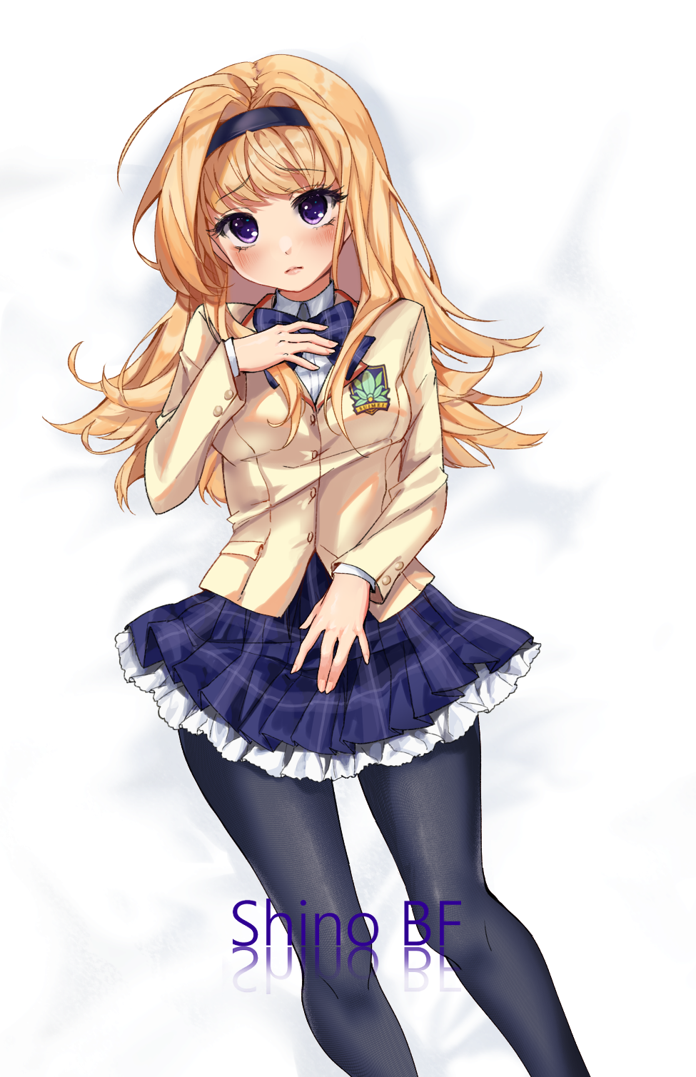 1girl black_hairband black_pantyhose blazer blonde_hair blush bow bowtie brown_jacket chaos;head collared_shirt dakimakura_(medium) dress_shirt hairband highres holding jacket long_hair looking_at_viewer lying nishijou_nanami on_back pantyhose plaid_bow plaid_bowtie plaid_clothes plaid_skirt pleated_skirt purple_bow purple_bowtie purple_eyes purple_skirt red_trim school_uniform science_adventure shinobf shirt skirt solo suimei_academy_school_uniform white_shirt