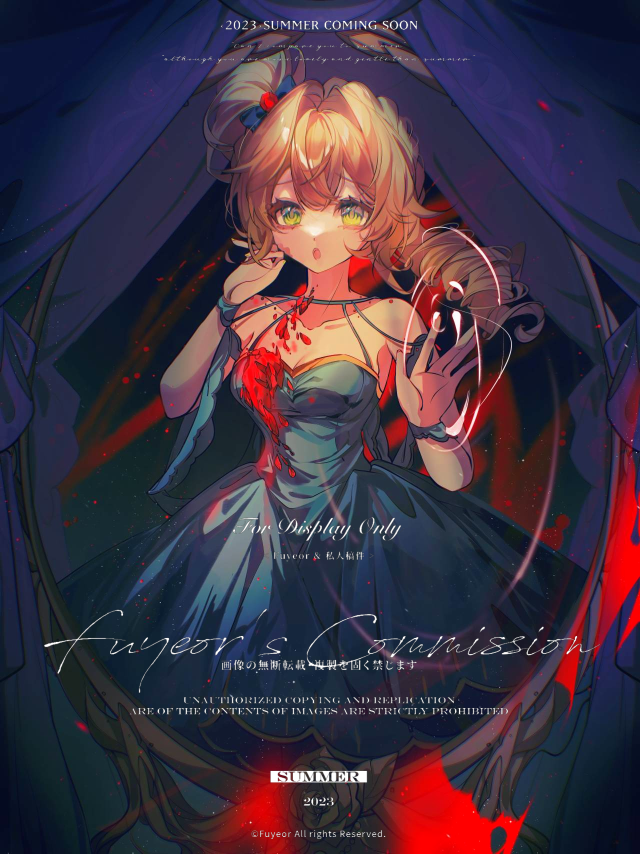 1girl :o bare_shoulders blonde_hair blue_dress breasts cleavage curtains dark_background dress drill_hair fuyeor green_eyes hands_up highres long_hair looking_at_viewer medium_breasts official_alternate_costume reverse:1999 side_drill sleeveless sleeveless_dress solo sotheby upper_body watermark