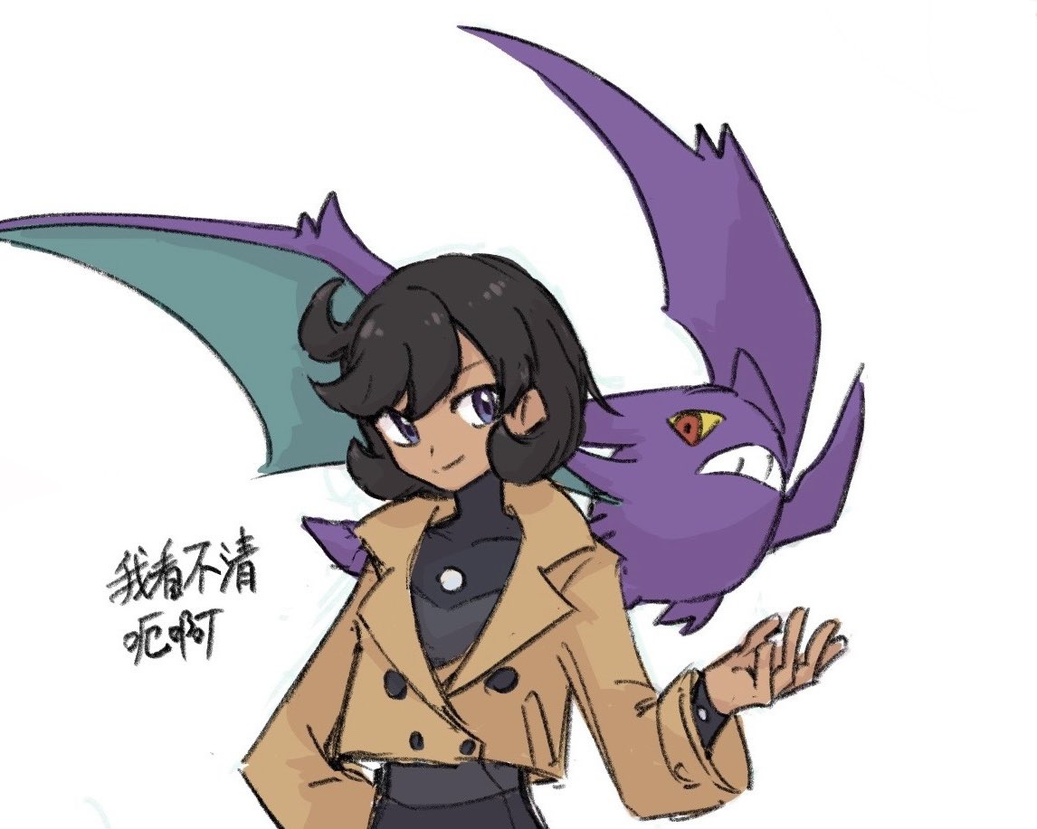 1girl black_bodysuit black_hair bodysuit bodysuit_under_clothes brown_jacket closed_mouth covered_collarbone crobat emma_(pokemon) gen_2_pokemon grey_eyes jacket long_sleeves nintendo pokemon pokemon_(creature) pokemon_legends:_z-a short_hair simple_background smile split_mouth translation_request white_background xlii_idk