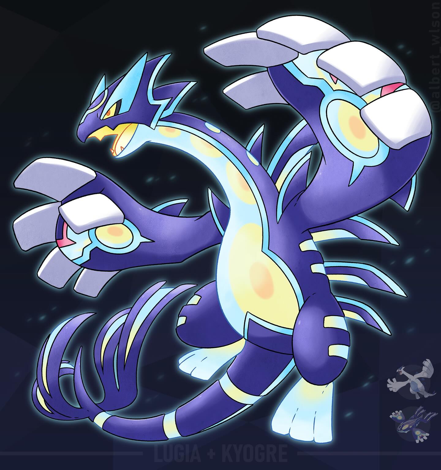 albrt-wlson animal_focus character_name colored_sclera commentary english_commentary fangs full_body fusion gen_2_pokemon gen_3_pokemon highres kyogre legendary_pokemon lugia nintendo no_humans official_art_inset open_mouth orange_eyes pokemon pokemon_(creature) pokemon_focus primal_kyogre procreate_(medium) reference_inset solo v-shaped_eyes yellow_sclera