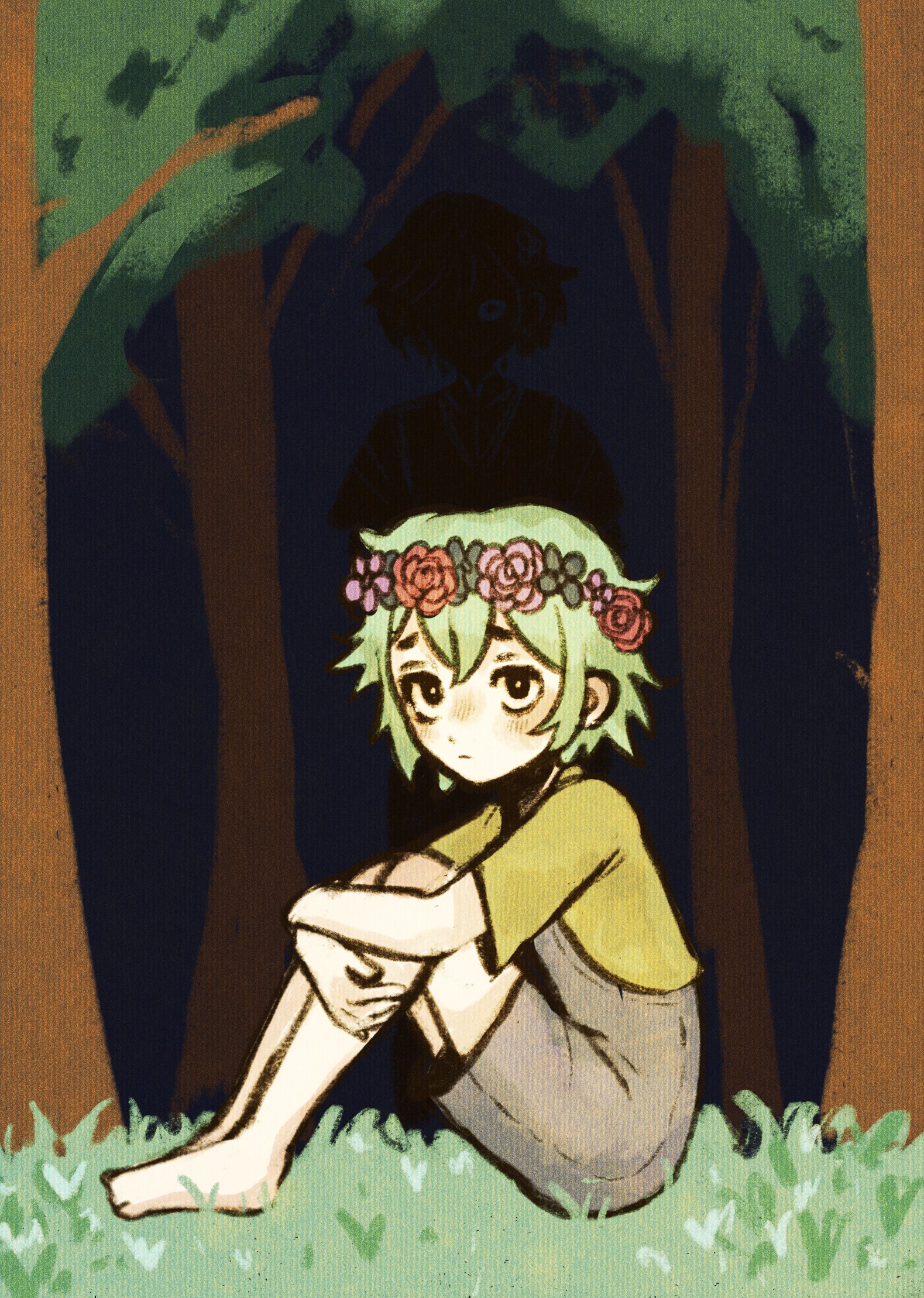 2boys alternate_eye_color barefoot basil_(headspace)_(omori) basil_(omori) black_eyes blue_overalls bright_pupils closed_mouth dual_persona flower grass green_hair green_shirt head_wreath highres knees_up looking_at_viewer male_focus multiple_boys omori ottie_pops overall_shorts overalls shirt short_hair short_sleeves sitting stranger_(omori) t-shirt tree white_pupils