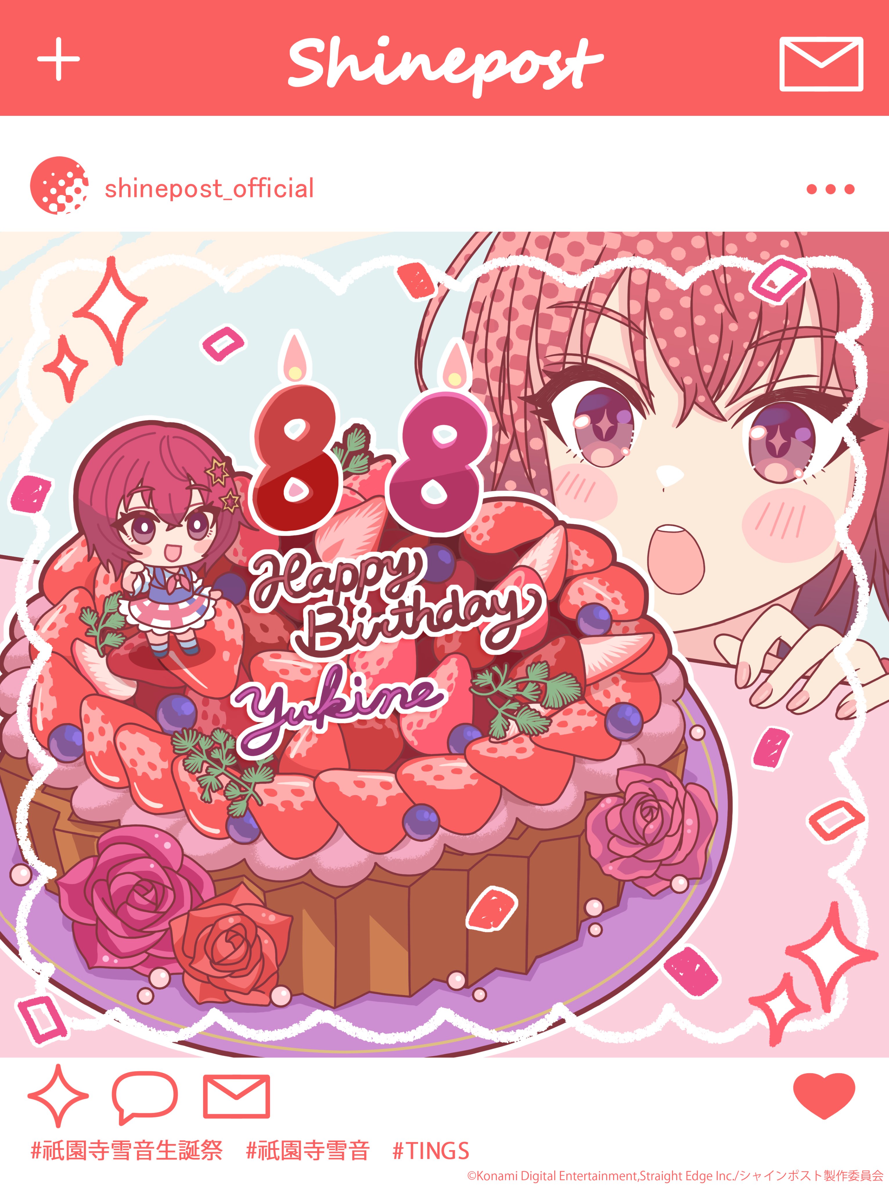 +_+ 1girl absurdres artist_request birthday_cake blush_stickers cake character_doll confetti copyright_notice doll flower food fruit gionji_yukine happy_birthday highres official_art open_mouth pink_flower pink_rose plate red_eyes red_flower red_hair red_rose rose shine_post social_network solo sparkle strawberry table teeth translation_request upper_teeth_only