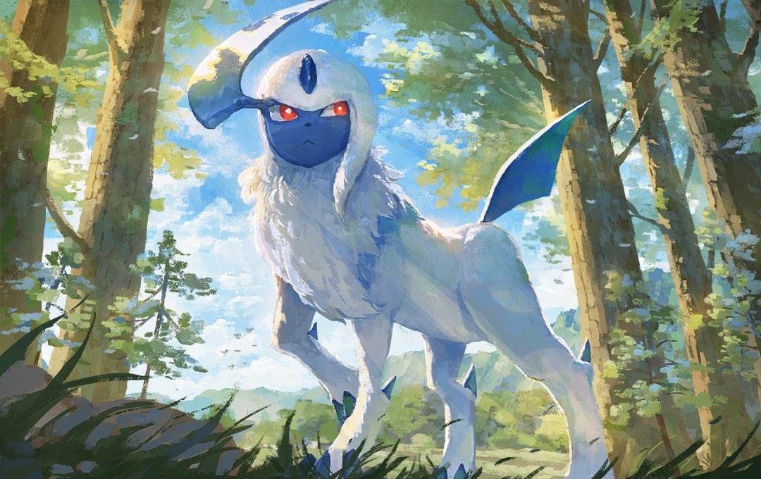 absol animal_focus blue_sky bright_pupils closed_mouth day fjsmu gen_3_pokemon grass horns nintendo no_humans outdoors pokemon pokemon_(creature) pokemon_focus pokemon_tcg red_eyes second-party_source single_horn sky solo tree white_pupils