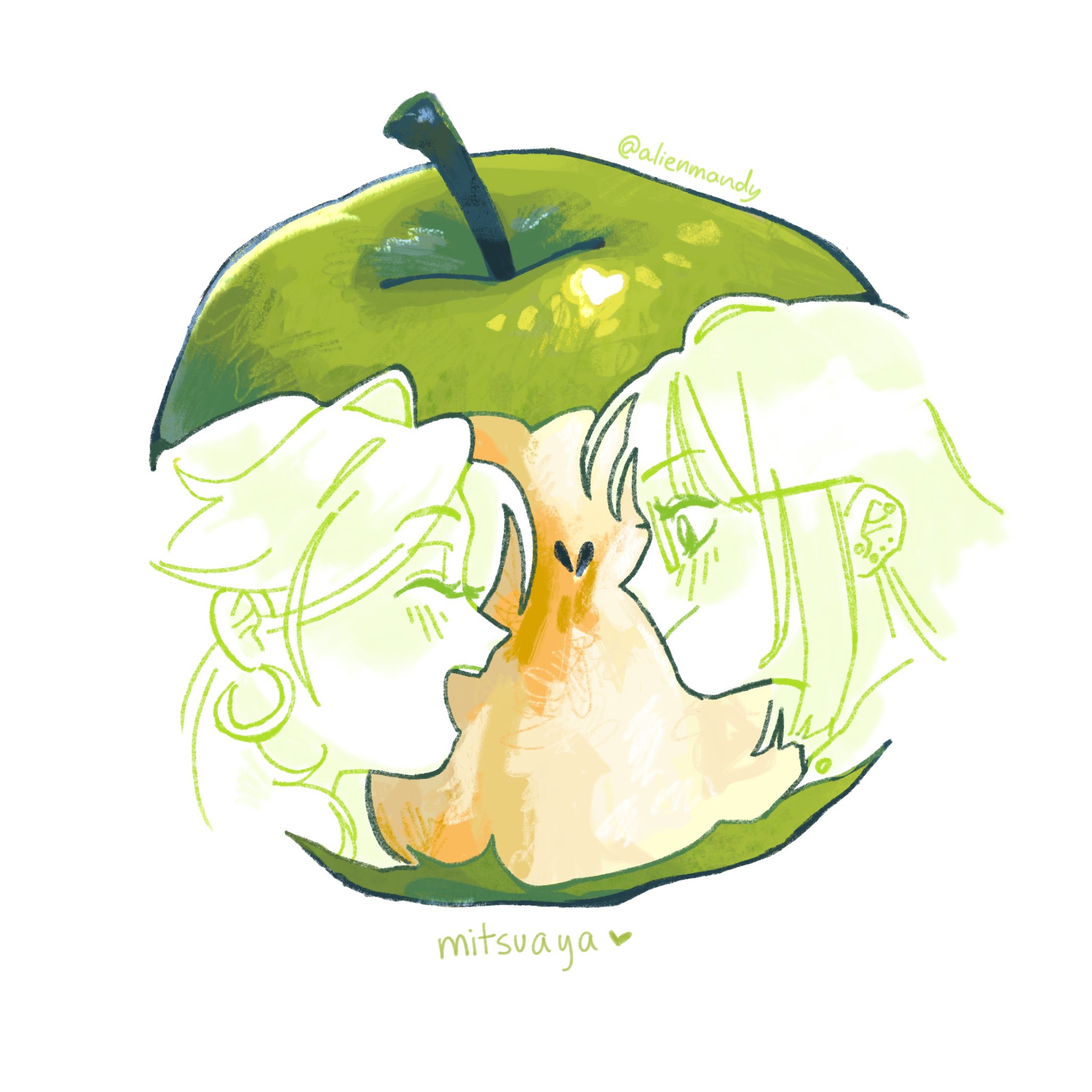 2girls apple bitten_apple closed_eyes closed_mouth commentary ear_piercing earrings english_commentary food food_bite fruit glasses green_apple heart highres hoop_earrings jewelry kininatteru_hito_ga_otoko_ja_nakatta koga_mitsuki mandy_(alienmandy) multiple_girls oosawa_aya open_mouth piercing seed pairing_name twitter_username