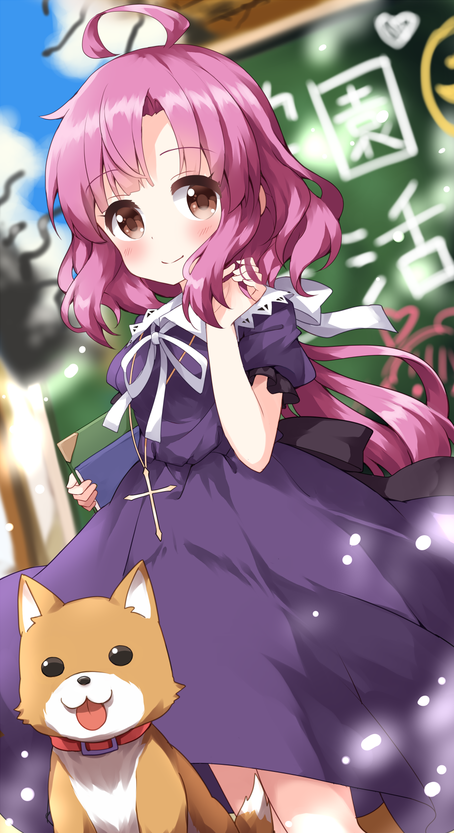 1girl ahoge animal blunt_bangs blush book brown_eyes closed_mouth commentary_request day dog dress feet_out_of_frame frilled_sleeves frills gakkou_gurashi! hand_up highres holding holding_book looking_at_viewer outdoors parted_bangs pink_hair purple_dress ruu_(tksymkw) sakura_megumi short_hair short_sleeves smile solo standing taroumaru_(gakkou_gurashi)