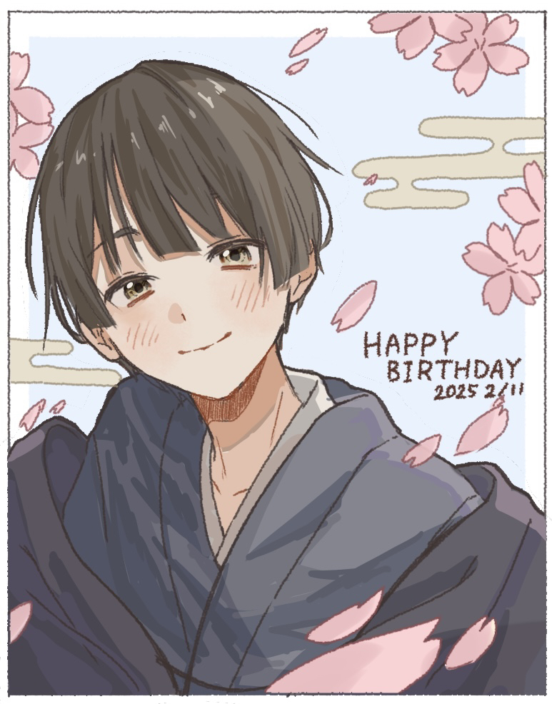 1boy axis_powers_hetalia black_hair black_haori blue_sky blush border cherry_blossoms closed_mouth collarbone commentary_request dated day egasumi english_text flower grey_kimono haori happy_birthday japan_(hetalia) japanese_clothes kimono looking_at_viewer male_focus negi_01412 open_clothes outdoors petals pink_flower short_hair sky smile solo upper_body white_border yellow_eyes