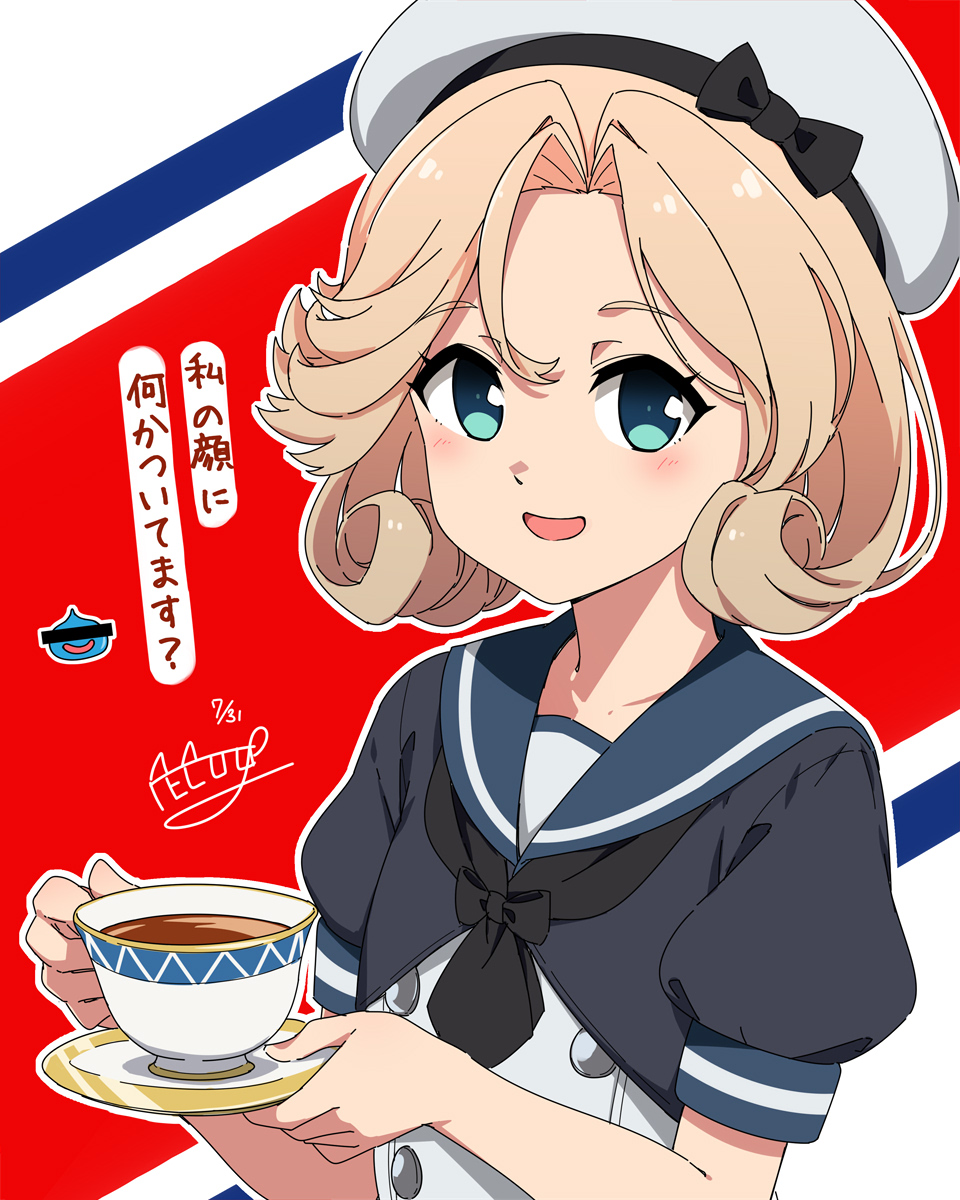 1girl black_jacket black_neckerchief blonde_hair blue_eyes blue_sailor_collar censored censored_identity commentary_request crossover cup dragon_quest dress hat highres jacket janus_(kancolle) kantai_collection looking_at_viewer neckerchief necono_(nekonosora1207) one-hour_drawing_challenge open_mouth parted_bangs sailor_collar sailor_dress sailor_hat saucer short_hair short_sleeves signature slime_(dragon_quest) smile solo teacup translation_request upper_body white_dress white_hat