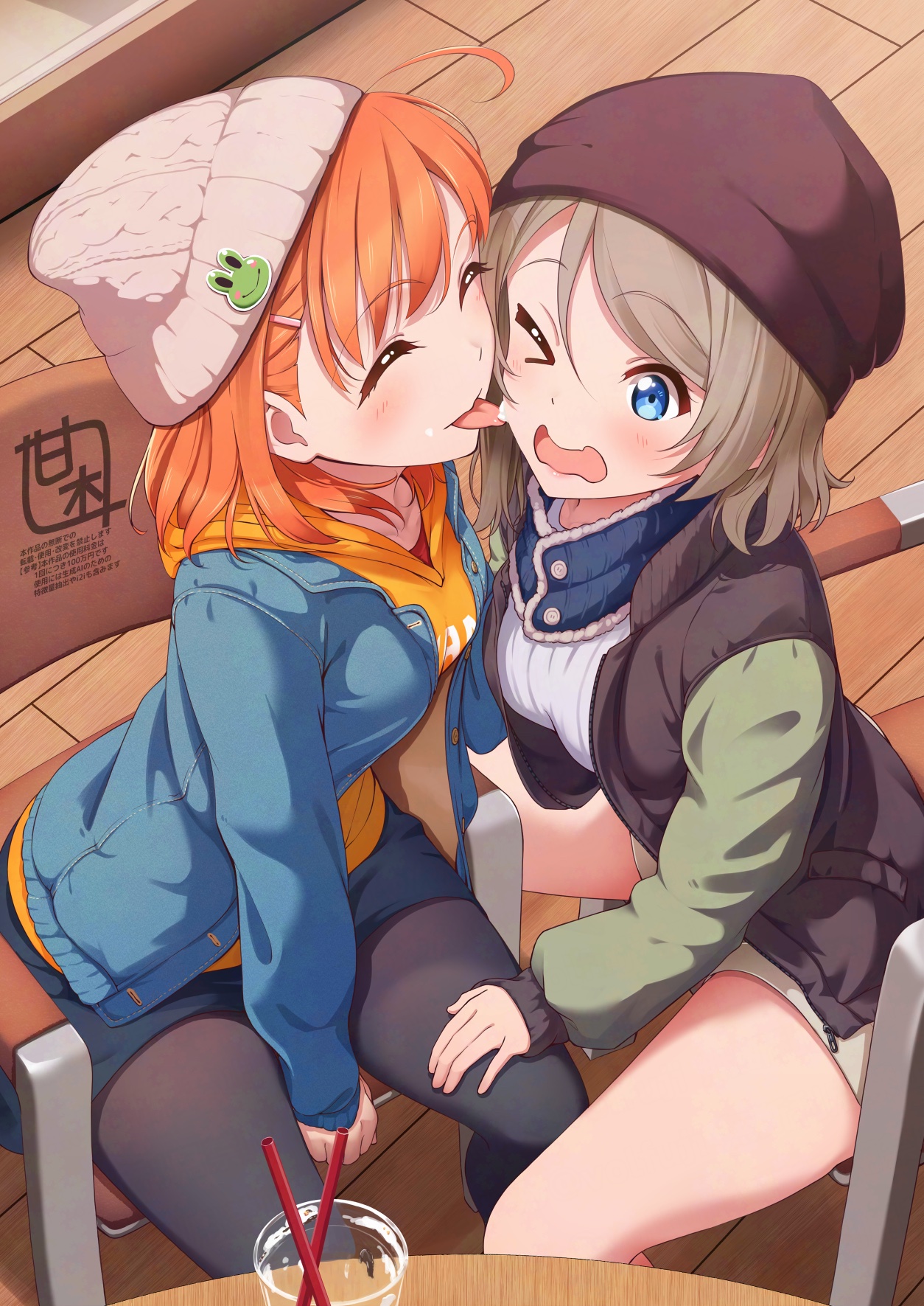 2girls ahoge amaki-chan_(volfuji) beanie blush breasts brown_hair closed_eyes dot_nose drink from_behind grey_hair hand_on_another's_thigh hat highres hood hoodie jacket knit_hat large_breasts legs licking looking_to_the_side love_live! love_live!_sunshine!! multiple_girls one_eye_closed open_mouth orange_hair pantyhose short_hair shorts sitting spread_legs sweater takami_chika thiths tongue tongue_out vest watanabe_you wavy_hair yuri