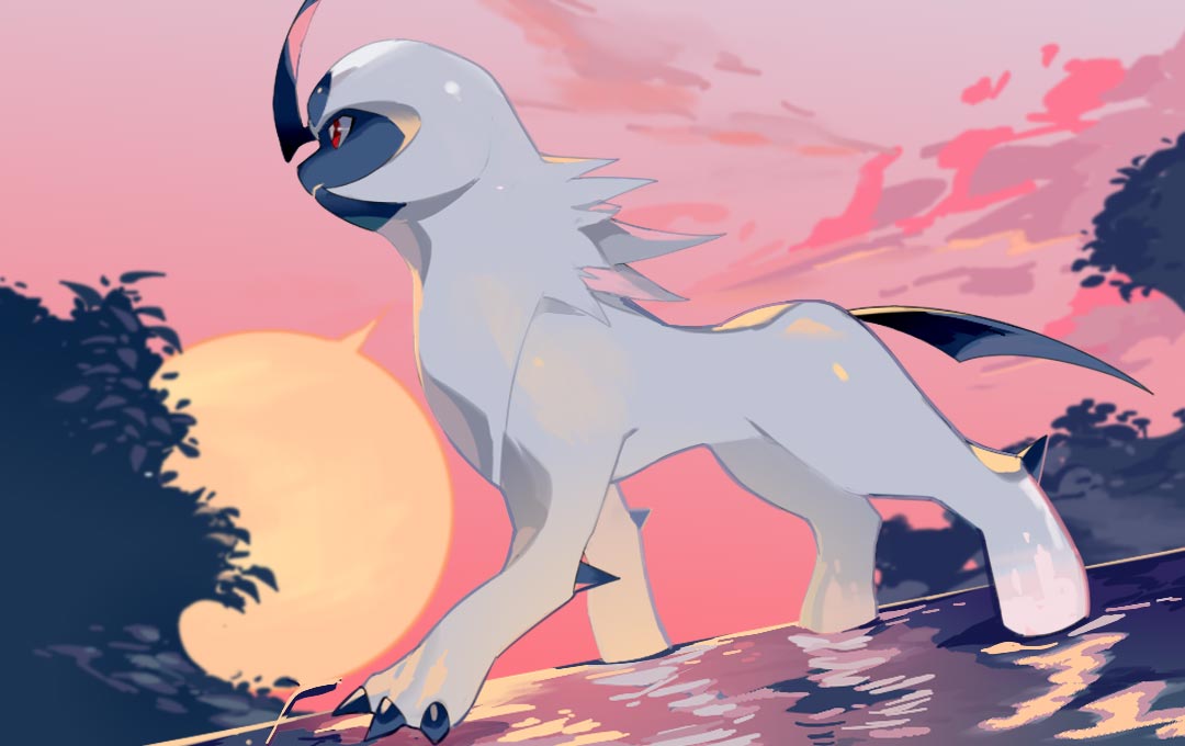 absol animal_focus cloud gen_3_pokemon horns limboom nintendo no_humans outdoors pokemon pokemon_(creature) pokemon_focus pokemon_tcg red_eyes second-party_source single_horn sky sun tree wading water