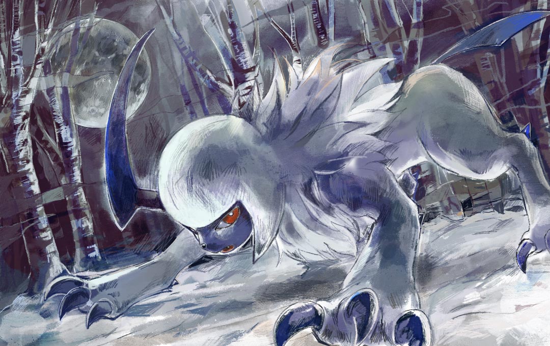 absol animal_focus bare_tree bright_pupils claws full_moon gen_3_pokemon horns moon night nintendo no_humans okawachi_chiaki open_mouth pokemon pokemon_(creature) pokemon_focus pokemon_tcg red_eyes second-party_source single_horn snow tree white_pupils