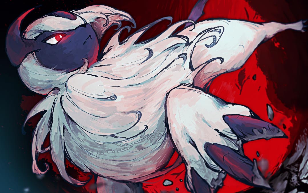 absol animal_focus artist_request bright_pupils check_artist claws closed_mouth debris gen_3_pokemon horns nintendo no_humans nonono_no pokemon pokemon_(creature) pokemon_focus pokemon_tcg red_eyes second-party_source single_horn white_pupils
