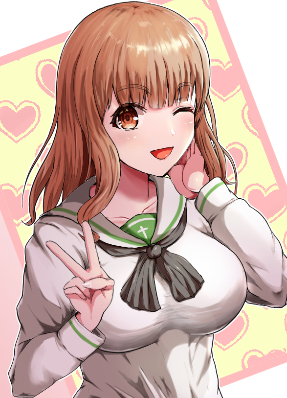 1girl blush breasts girls_und_panzer large_breasts looking_at_viewer one_eye_closed ooarai_school_uniform open_mouth orange_eyes orange_hair solo takebe_saori v yahow