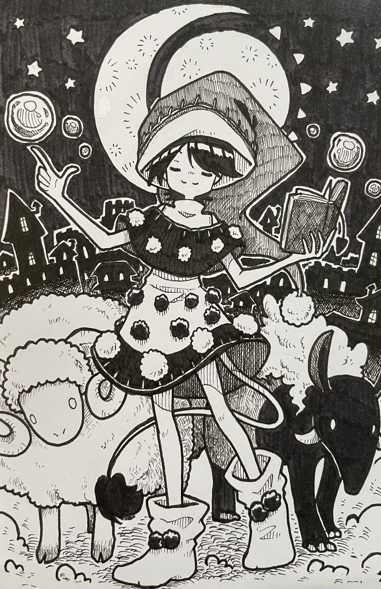 1girl baku_(creature) blob book boots closed_eyes closed_mouth commentary doremy_sweet dream_soul facing_viewer greyscale hat highres holding holding_book horns monochrome nightcap open_book pom_pom_(clothes) sheep smile solo suteruko tail tapir_tail touhou traditional_media