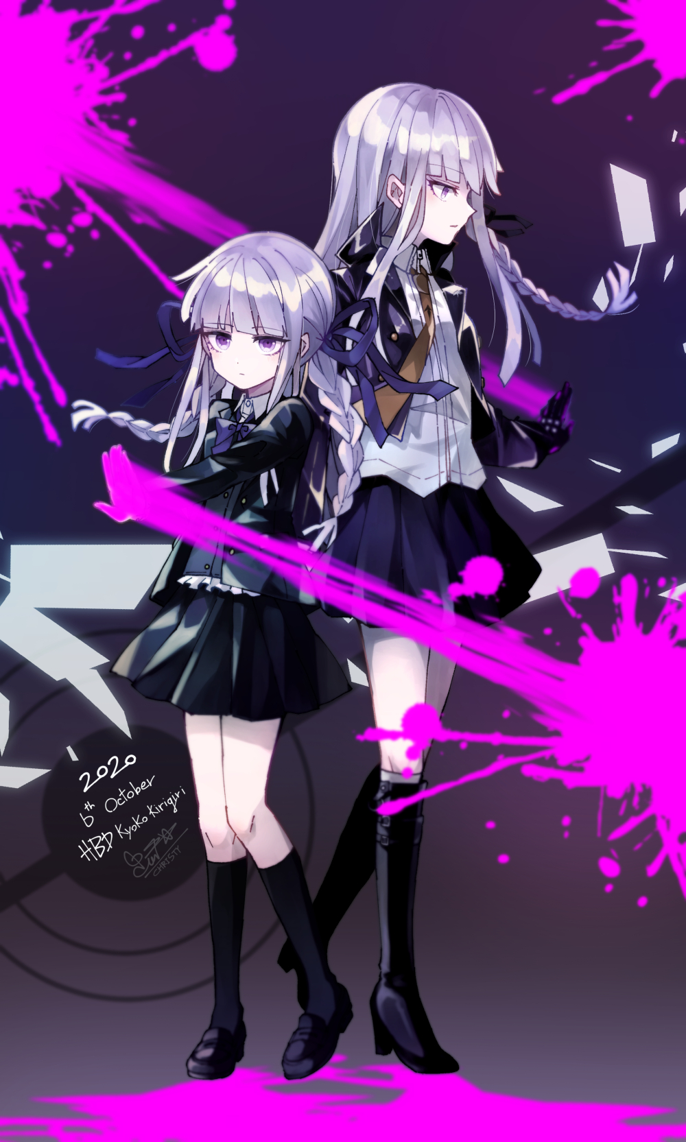 2020 2girls black_background black_boots black_gloves black_jacket black_ribbon black_shoes black_skirt black_socks blazer blood blood_splatter blunt_bangs boots bow bowtie braid brown_necktie character_name child christy_mii collared_jacket collared_shirt danganronpa danganronpa:_trigger_happy_havoc danganronpa_(series) danganronpa_kirigiri dot_nose expressionless floating_hair frilled_shirt frills full_body gloves hair_ribbon high_heel_boots high_heels highres jacket kirigiri_kyoko knee_boots kneehighs knees lapels long_hair long_sleeves looking_ahead low_twin_braids miniskirt multiple_girls necktie notched_lapels open_clothes open_jacket outstretched_arm pink_blood pleated_skirt pointy_nose purple_bow purple_bowtie purple_eyes purple_hair purple_jacket purple_ribbon purple_skirt ribbon shirt shoes side_braid signature single_braid skirt socks standing studded_gloves time_paradox twin_braids uwabaki very_long_hair white_shirt white_skirt wiping_blood