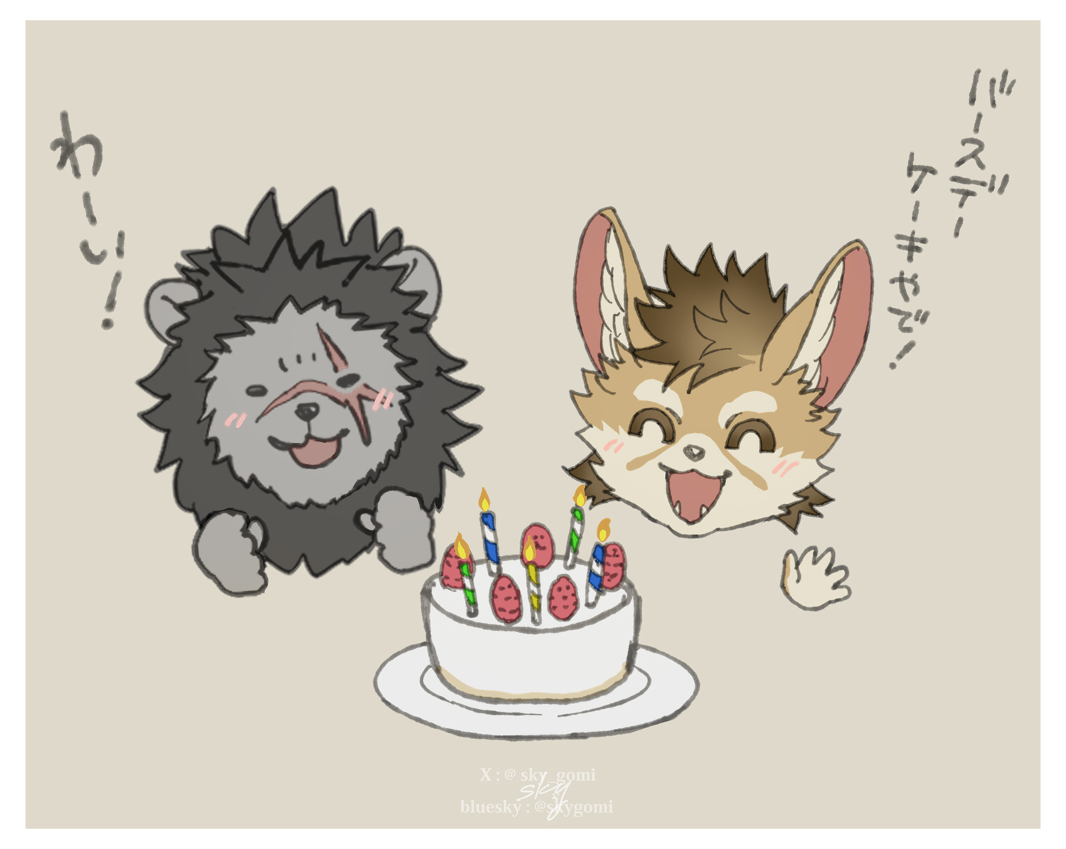 2boys adza_(crave_saga) animal_ears artist_name birthday_cake blush cake chibi chibi_only closed_eyes commentary_request crave_saga cross_scar fangs food fox_boy fox_ears furry furry_male happy_birthday head_only lion_boy lion_ears lion_mane male_focus multiple_boys open_mouth scar scar_across_eye scar_on_face scar_on_nose signature sky_(sora_no_gomibako) smile translated wheel_(crave_saga)