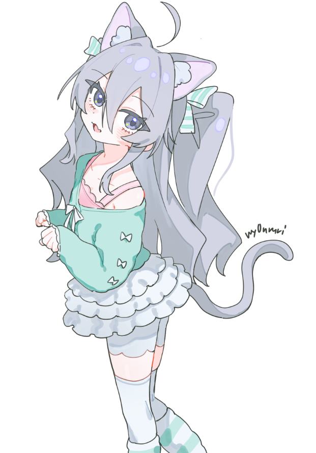1girl ahoge animal_ear_fluff animal_ears artist_name blush camisole cat_ears cat_girl cat_tail collarbone fang feet_out_of_frame from_side grey_eyes grey_hair hair_between_eyes hair_ribbon kurobeko_(kur0bek0) layered_skirt leg_warmers long_hair long_sleeves looking_at_viewer loose_socks off_shoulder open_mouth original paw_pose ribbon shirt shorts sidelocks simple_background skirt sleeves_past_wrists smile socks solo standing striped_clothes sweater tail thighhighs two_side_up white_background white_shorts white_skirt white_thighhighs