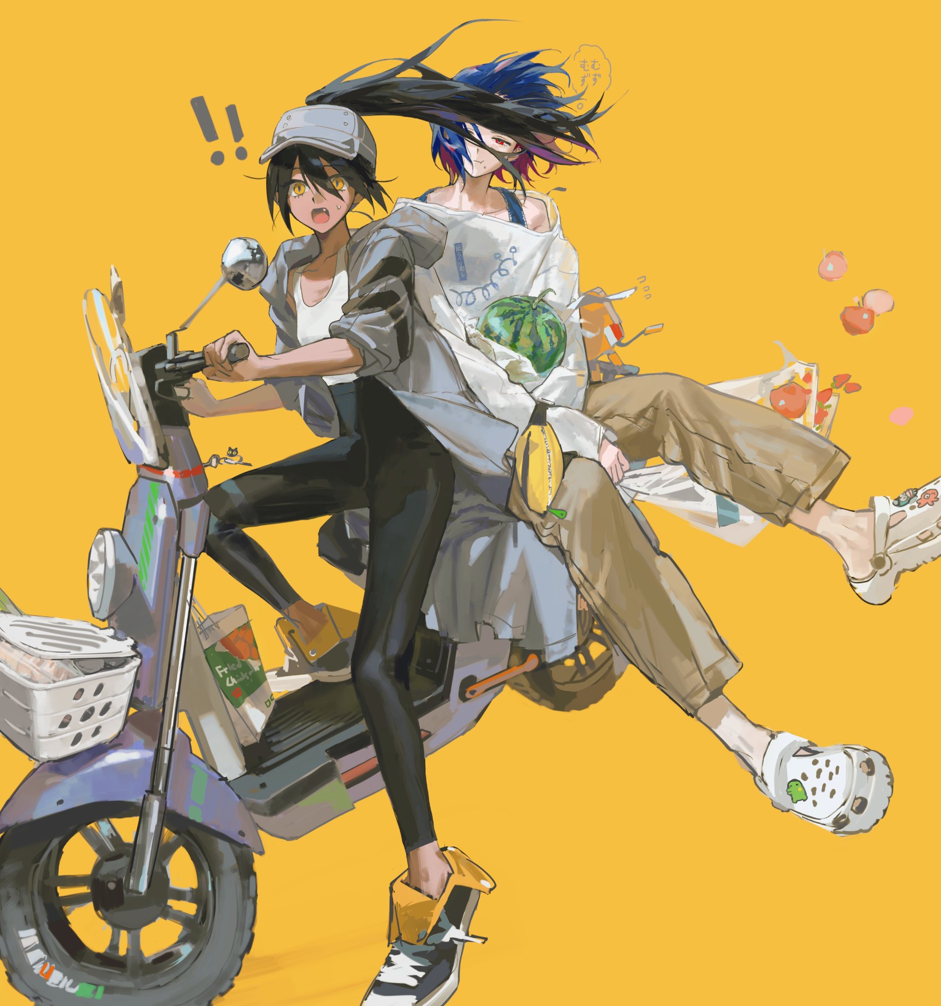 ! !! 1boy 1girl apple bag baseball_cap black_hair black_leggings black_shoes blue_eyes blue_hair brown_pants coat colored_inner_hair commentary_request conch_(gundam) crocs diurtion fang fanny_pack floating_hair food fruit grey_coat grey_hat gundam gundam_gquuuuuux hair_between_eyes hat highres holding holding_bag hood hooded_coat leggings long_sleeves looking_at_viewer motor_vehicle multicolored_hair nyaan_(gundam_gquuuuuux) off-shoulder_shirt off_shoulder on_scooter one_eye_closed open_clothes open_coat open_mouth pants plastic_bag pout red_eyes red_hair scooter shirt shoes shuji_ito sidesaddle simple_background sleeves_pushed_up slit_pupils small_sweatdrop sneakers speech_bubble strawberry thought_bubble tomato translation_request two-tone_hair watermelon white_shirt white_shoes yellow_background