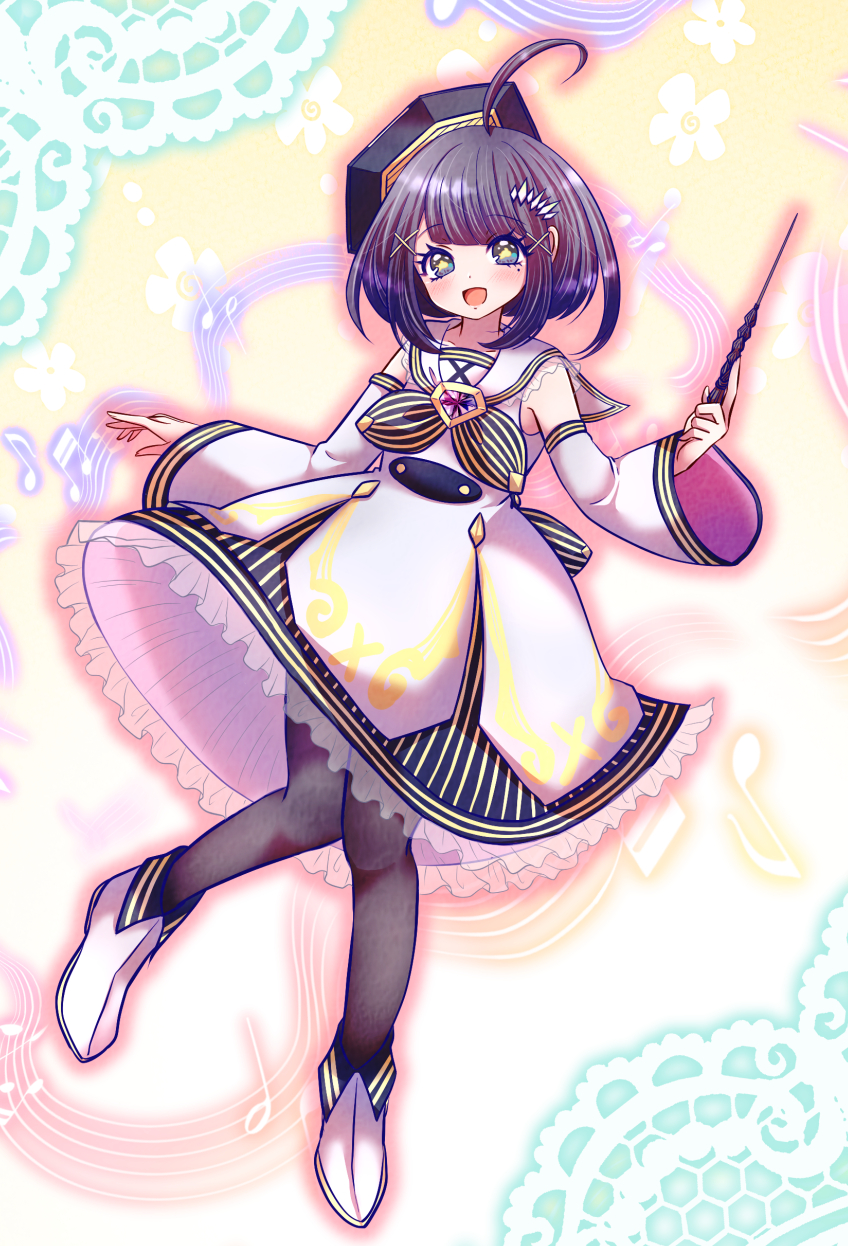 1girl ahoge black_pantyhose blush brown_hair detached_sleeves dress duel_monster frilled_dress frills green_eyes hat highres holding holding_wand long_sleeves looking_at_viewer medium_hair mole mole_under_eye momobesaeka musical_note musical_staff open_mouth pantyhose shoes smile solfachord_primoria solo wand white_dress white_shoes wide_sleeves yu-gi-oh!