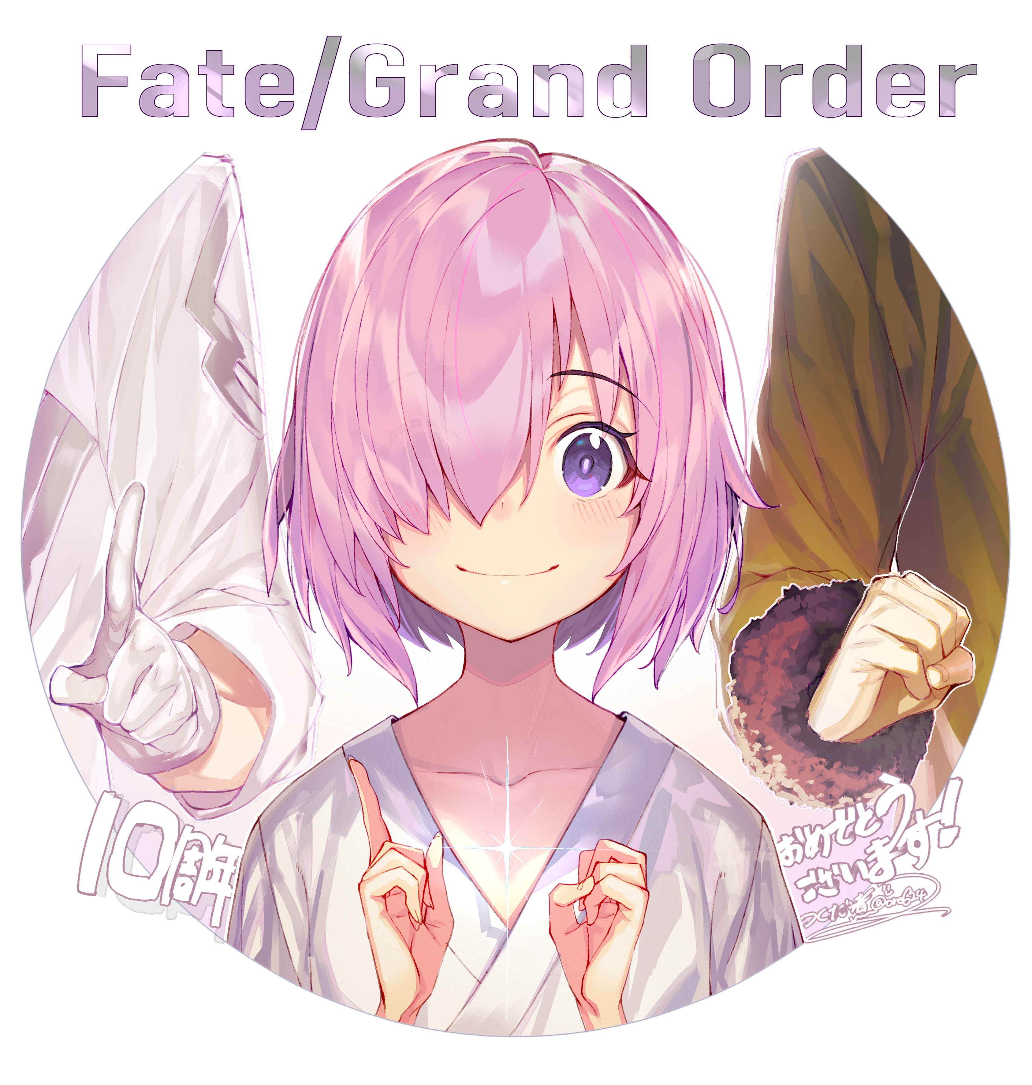 1girl 2boys absurdres aged_down anniversary artist_name border coat copyright_name eyes_visible_through_hair fate/grand_order fate_(series) fur-trimmed_sleeves fur_trim gloves green_coat hair_over_one_eye happy_anniversary highres hospital_gown index_finger_raised lev_lainur_flauros long_sleeves looking_at_viewer mash_kyrielight multiple_boys number-shaped_hands official_alternate_costume out_of_frame pink_hair purple_eyes romani_archaman round_border round_border short_hair signature simple_background tsukudani_(ore624) twitter_username upper_body white_background white_coat white_gloves
