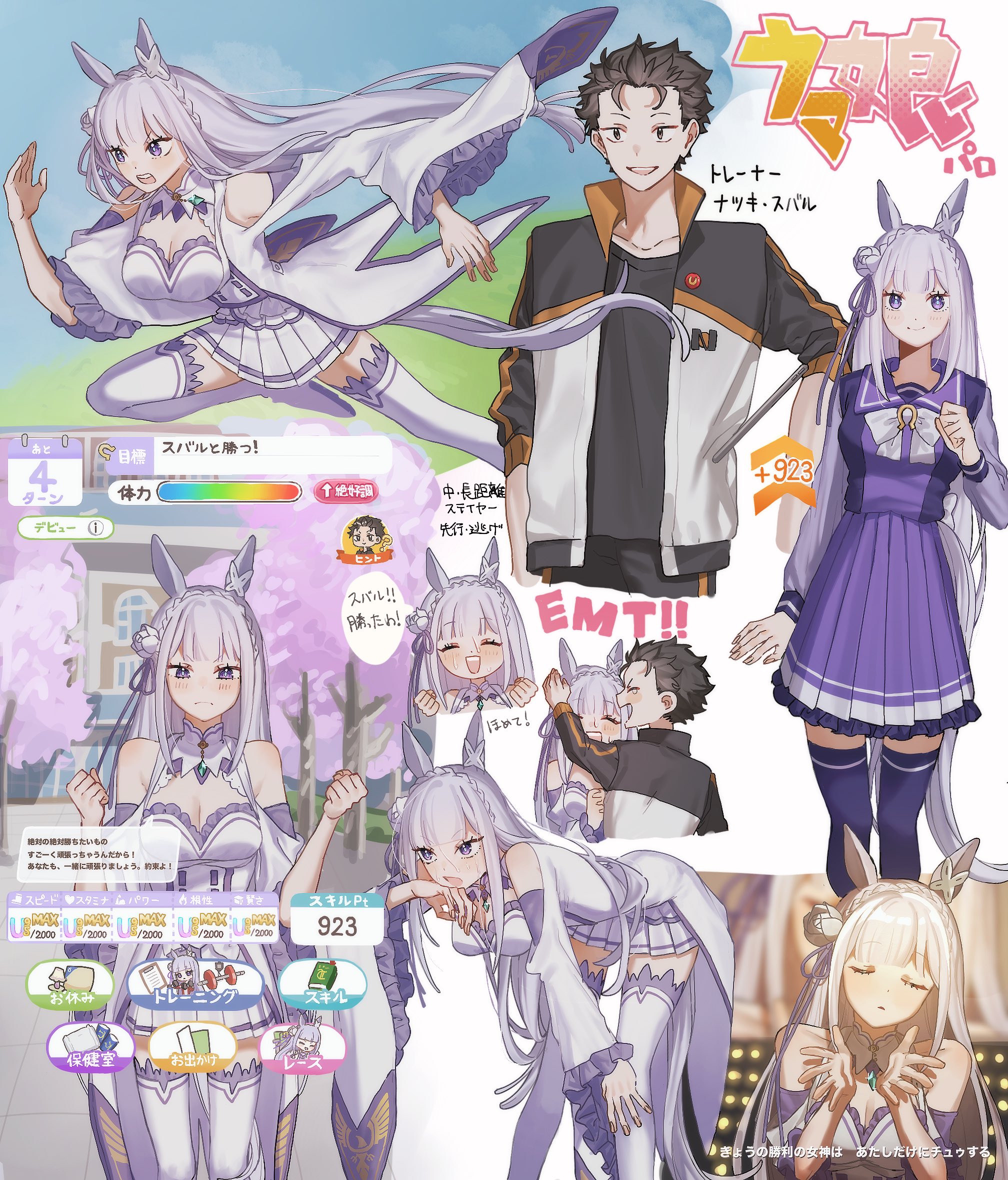 1boy 1girl alternate_species animal_ears braid crossover crown_braid drill_hair emilia_(re:zero) flower gameplay_mechanics hair_flower hair_ornament hair_slicked_back heads-up_display highres horse_ears horse_girl horse_tail jacket jouge2983 natsuki_subaru purple_eyes purple_hair re:zero_kara_hajimeru_isekai_seikatsu rose sailor_collar sailor_shirt school_uniform shirt tail tracen_school_uniform track_jacket track_suit twin_drills umamusume user_interface white_flower white_rose x_hair_ornament