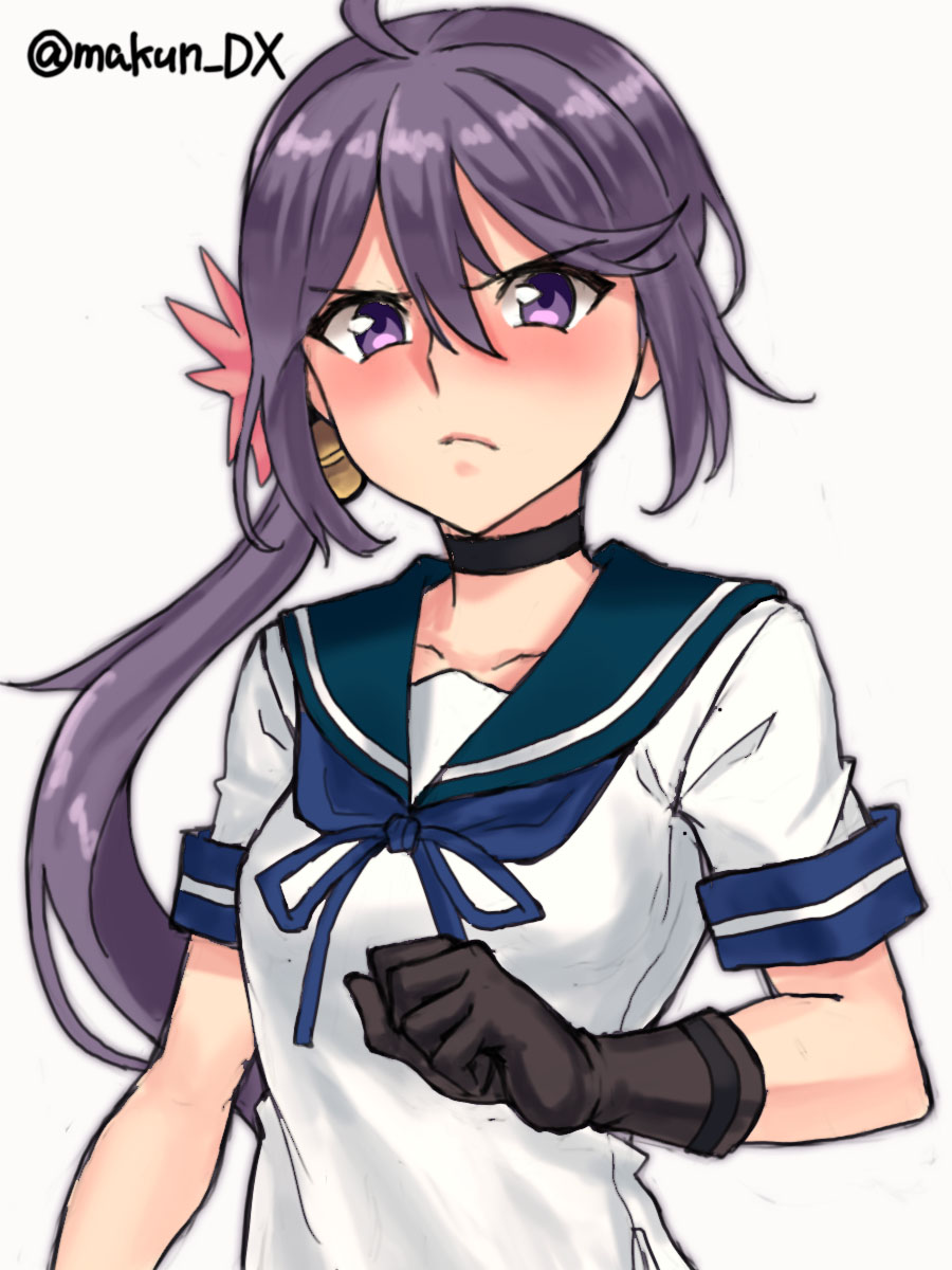 1girl akebono_(kancolle) akebono_kai_ni_(kancolle) bell bikini bikini_skirt black_choker black_gloves blue_neckerchief blue_sailor_collar choker flower gloves hair_bell hair_flower hair_ornament highres jingle_bell kantai_collection long_hair maakun_(makun_dx) neckerchief one-hour_drawing_challenge purple_eyes purple_hair sailor_collar school_uniform serafuku short_sleeves side_ponytail simple_background solo swimsuit twitter_username very_long_hair white_background