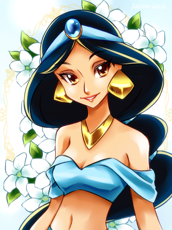 1girl aladdin_(movie) arabian_clothes black_hair breasts brown_eyes brown_hair dark-skinned_female dark_skin earrings jasmine_(disney) jewelry long_hair looking_at_viewer off_shoulder princess shirt smile solo su_(pixiv44447) very_long_hair