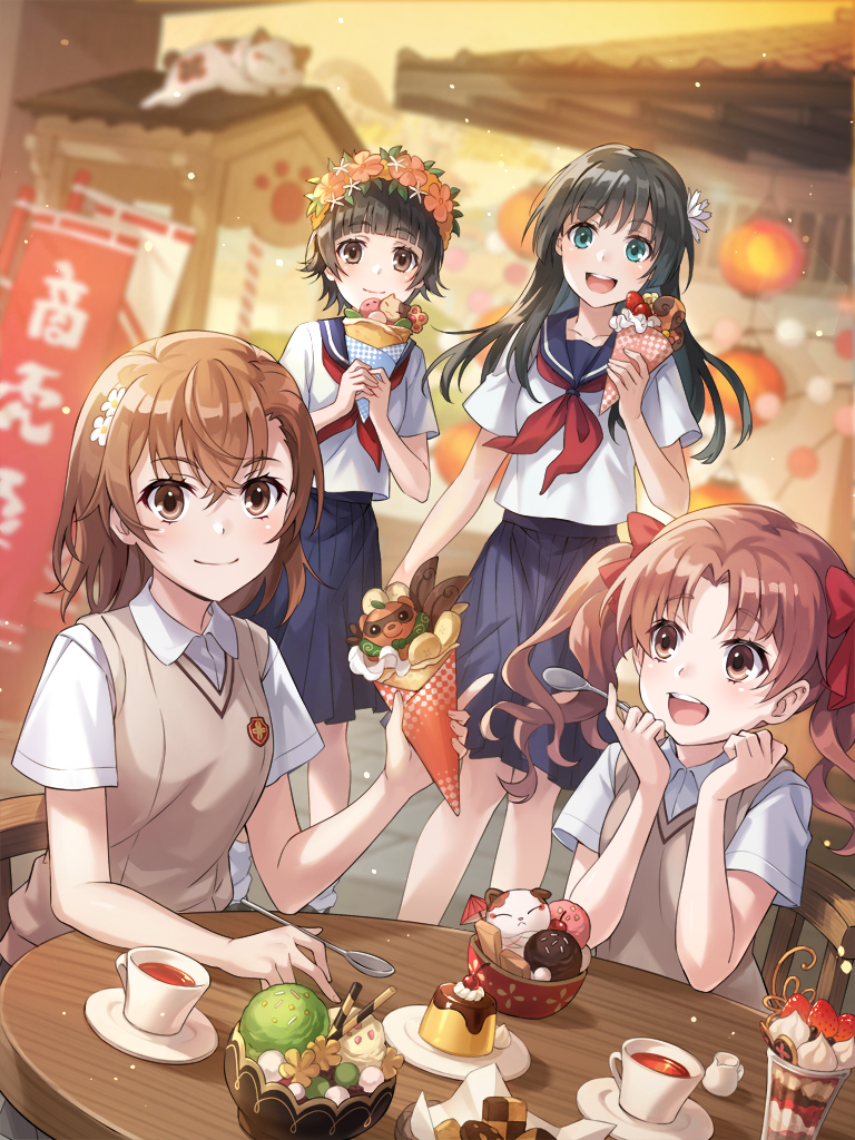 4girls :d asymmetrical_bangs black_hair blue_sailor_collar blue_skirt blurry blurry_background bow brown_eyes brown_hair brown_sweater_vest cat collared_shirt crepe cup flower food hair_bow hair_flower hair_ornament hairpin head_wreath holding holding_crepe holding_food holding_spoon ice_cream ice_cream_crepe long_hair looking_at_viewer misaka_mikoto multiple_girls neckerchief official_art open_mouth outdoors parfait pleated_skirt ragnador red_bow red_neckerchief sailor_collar sakugawa_school_uniform saten_ruiko school_emblem school_uniform serafuku shirai_kuroko shirt short_hair short_sleeves skirt smile spoon strawberry_parfait summer_uniform sweater_vest teacup toaru_kagaku_no_railgun toaru_majutsu_no_index tokiwadai_school_uniform twintails uiharu_kazari v-neck white_shirt