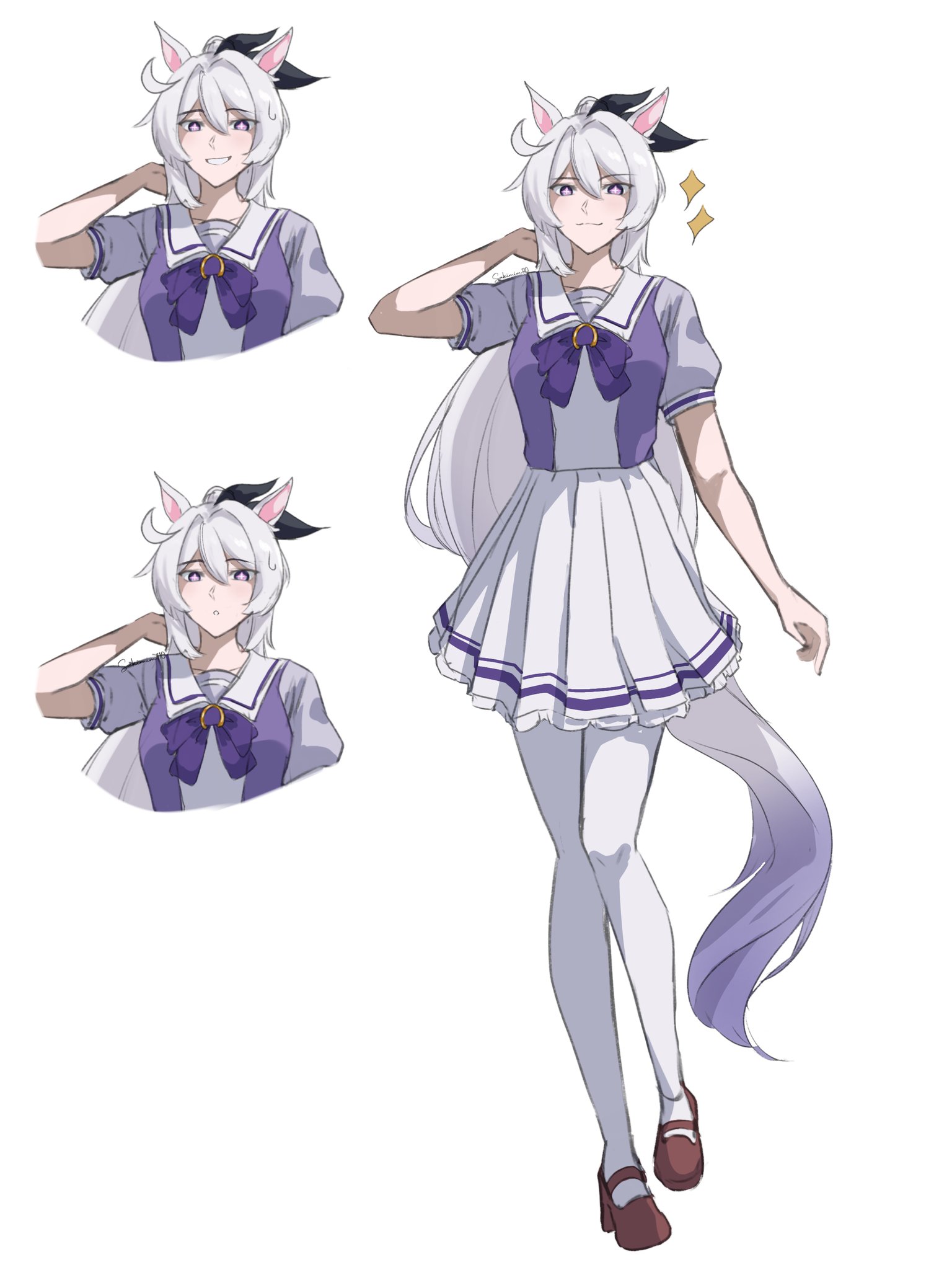1girl ahoge bow bowtie closed_mouth commentary english_commentary full_body highres honkai_(series) honkai_impact_3rd kiana_kaslana kiana_kaslana_(herrscher_of_finality) multiple_views pantyhose purple_bow purple_bowtie purple_eyes purple_shirt sakimim school_uniform shirt skirt smile solo sweatdrop tracen_school_uniform umamusume white_background white_hair white_pantyhose white_skirt