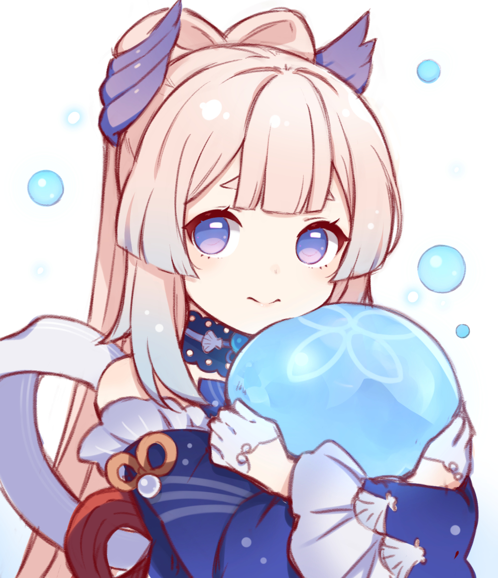 1girl bare_shoulders blunt_bangs bow-shaped_hair bubble closed_mouth colored_tips commentary_request genshin_impact gloves gradient_hair half_gloves haruneharu hug jellyfish long_hair long_sleeves looking_at_viewer multicolored_hair pink_hair purple_eyes sangonomiya_kokomi simple_background smile solo upper_body white_background white_gloves