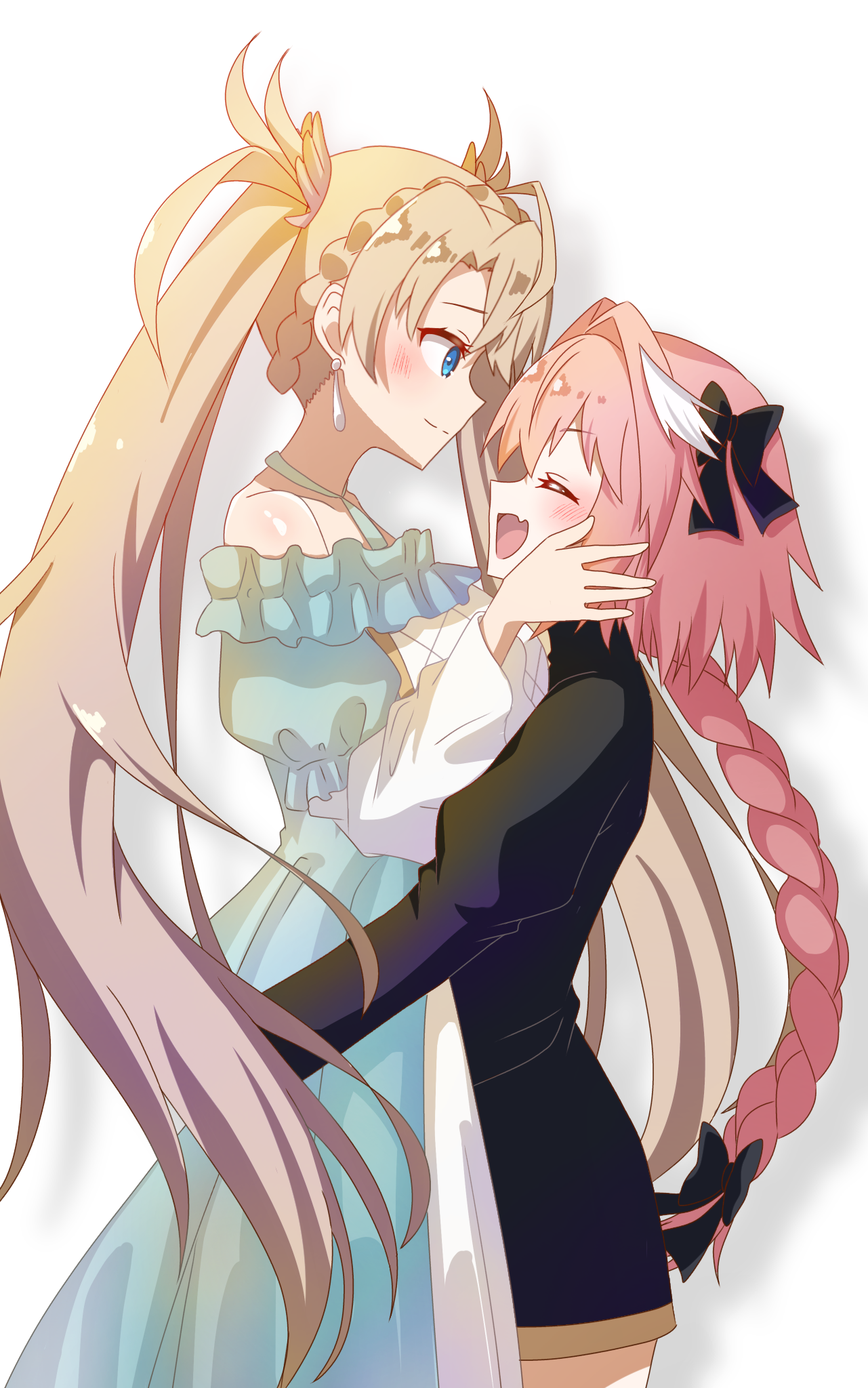 1boy 1girl ahoge astolfo_(fate) black_dress blonde_hair blue_dress blue_eyes blush bow bradamante_(fate) braid braided_ponytail breasts charlemagne_no_montjoie_kishidou! check_commentary closed_eyes commentary_request cousins crossdressing crossdressing_(mtf) dress earrings fang fate/grand_order fate_(series) frilled_sleeves frills hair_bow hair_intakes hands_on_another's_cheeks hands_on_another's_face highres hug huge_breasts jewelry long_dress long_hair multiple_hair_bows open_mouth pink_hair puffy_sleeves shadow short_dress simple_background single_hair_streak skin_fang smile tanutika trap twintails very_long_hair white_background white_hair