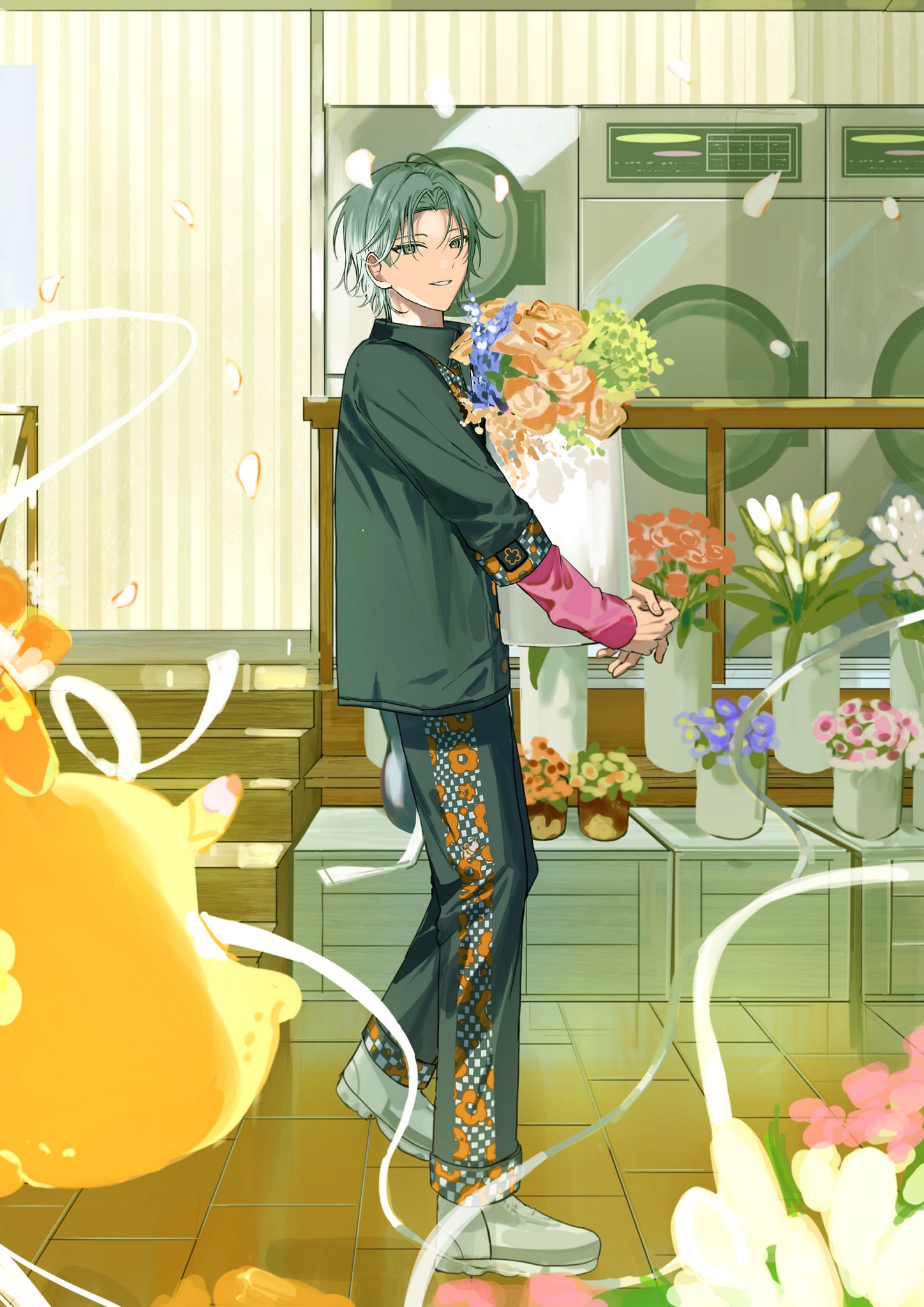 18trip 1boy 22kolink black_pants black_shirt falling_petals flower flower_pot from_side full_body grey_eyes grey_hair grey_shoes hachinoya_nagi highres holding holding_flower_pot long_sleeves looking_at_viewer male_focus pants parted_lips petals pink_flower purple_flower red_flower shirt shoes short_hair smile solo streamers tile_floor tiles washing_machine