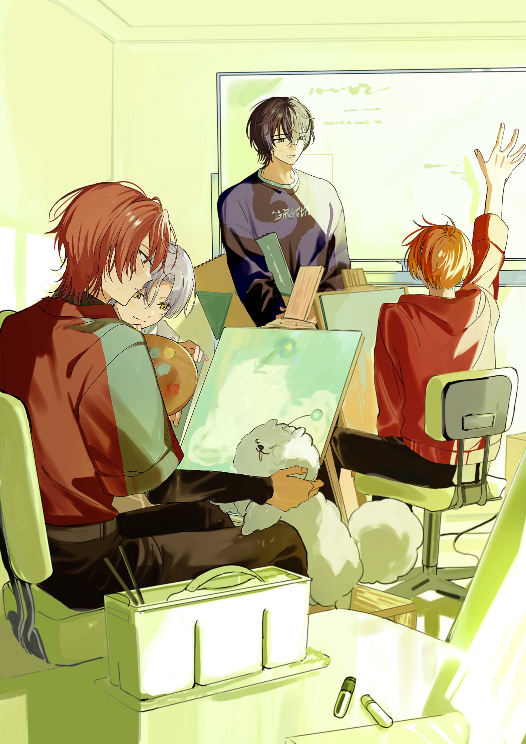 18trip 22kolink 4boys absurdres arm_up black_hair chair closed_mouth dog easel facing_away hair_between_eyes highres indoors isotake_akuta kinugawa_kiroku long_sleeves looking_at_another looking_at_object male_focus multiple_boys nishizono_renga oguro_kafka on_chair orange_hair painting_(object) petting red_hair red_shirt shirt short_hair sitting smile white_hair whiteboard yellow_eyes