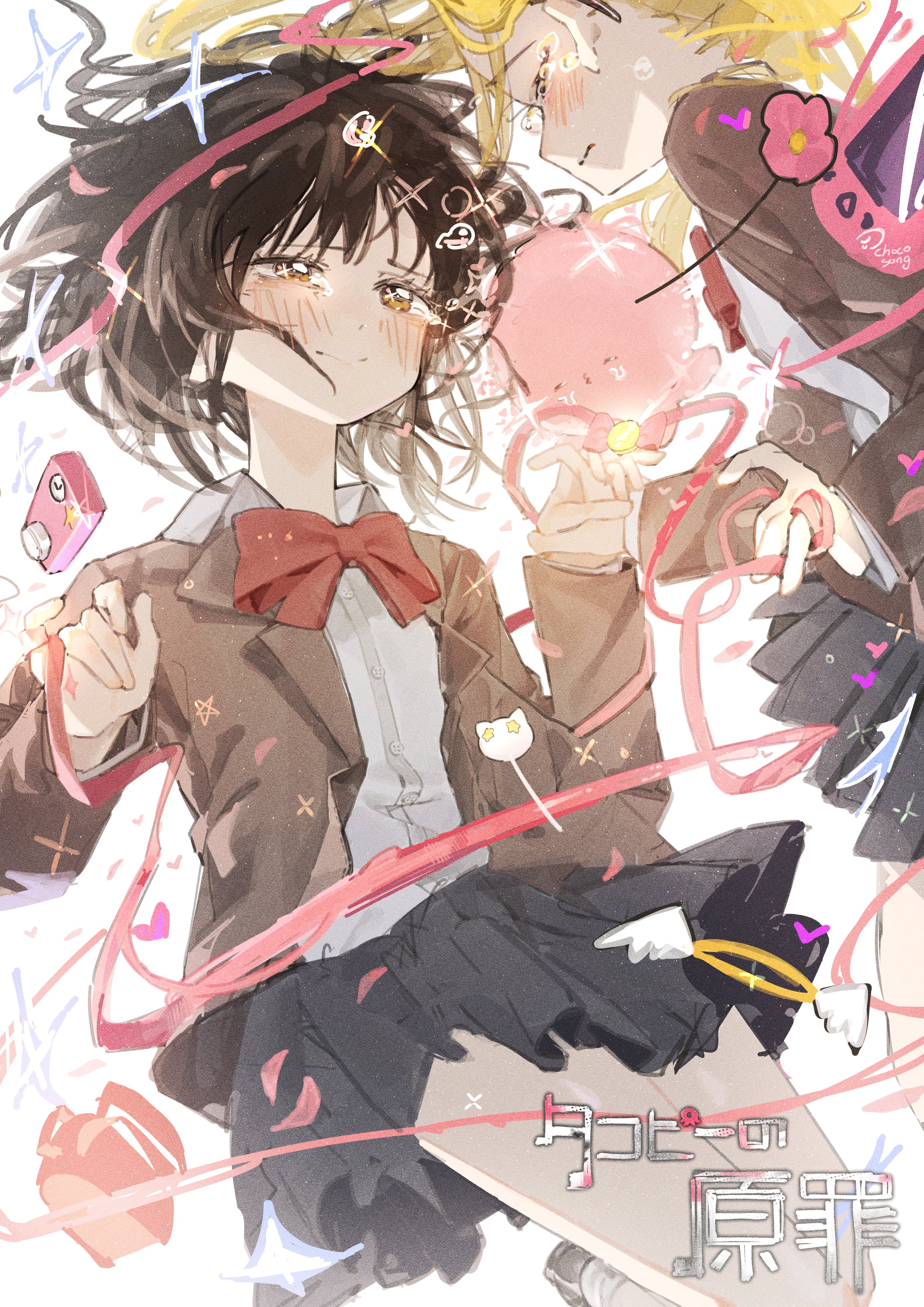2girls absurdres aged_up backpack bag black_hair blonde_hair blush brown_eyes camera chocosong closed_eyes closed_mouth half-closed_eyes highres holding_hands jacket kirarazaka_marina kuze_shizuka multiple_girls pleated_skirt red_ribbon ribbon school_uniform short_hair skirt takopii takopii_no_genzai tears