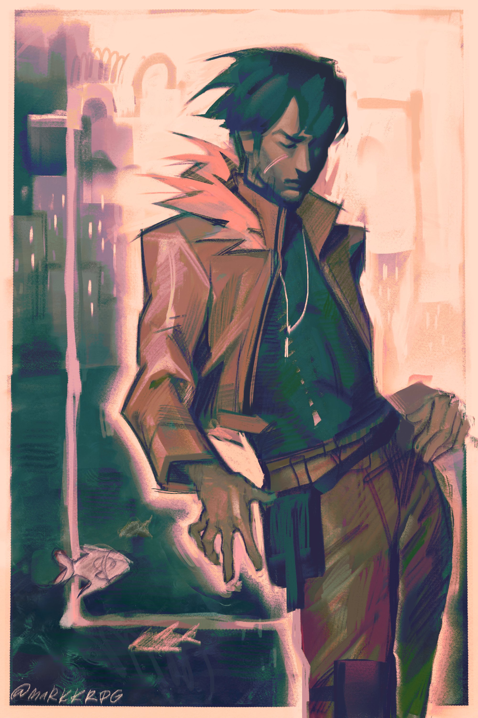 1boy absurdres belt black_hair black_shirt brown_coat city closed_eyes coat commentary fanny_pack feet_out_of_frame fish fur_collar hair_flowing_over hand_on_own_wrist highres jewelry limited_palette male_focus markkrpg narrowed_eyes necklace open_clothes open_coat original outline painterly popped_collar rockfish scar scar_on_face shirt short_hair solo untranslatable_commentary twisted_torso white_outline