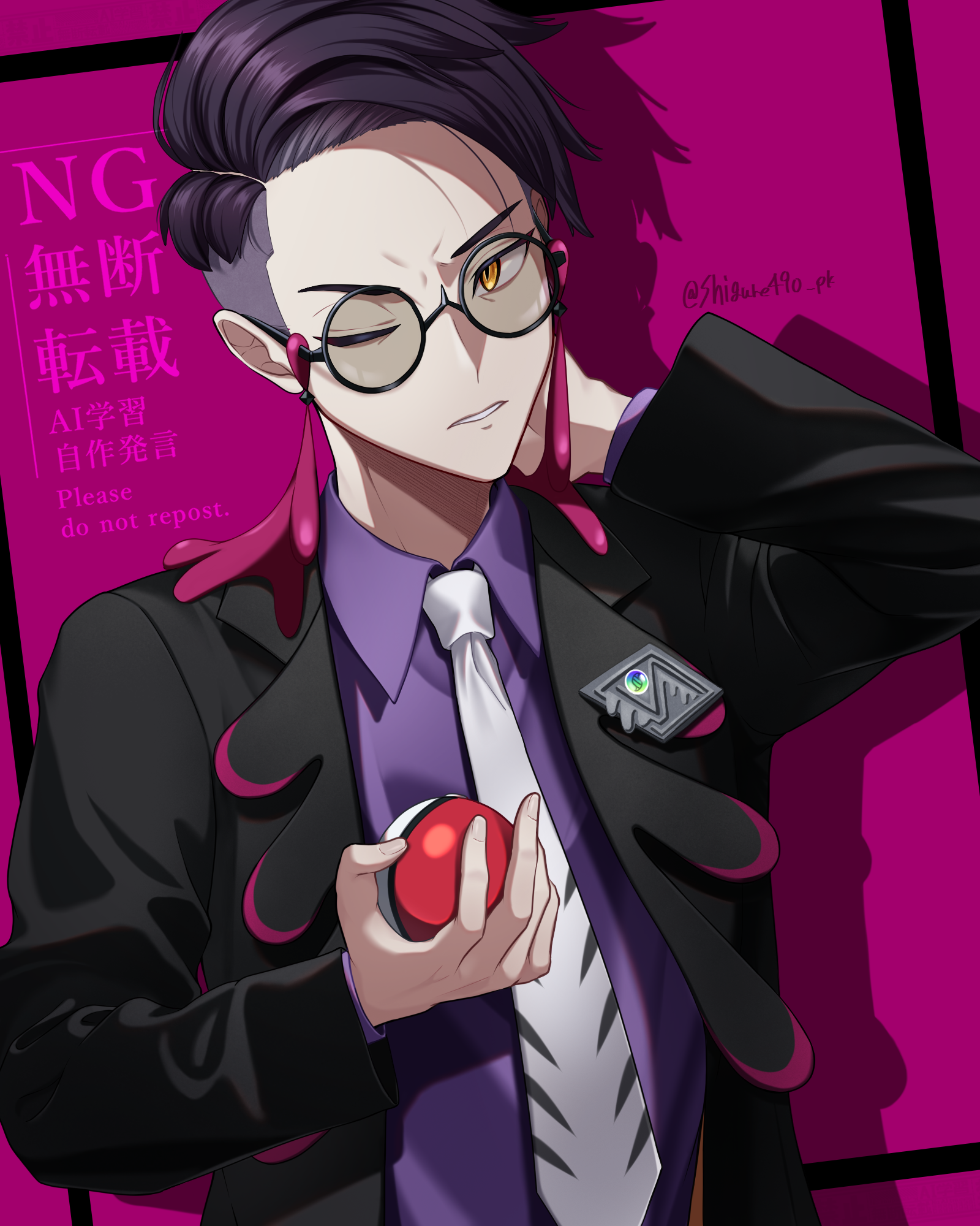 1boy black-framed_eyewear black_hair black_jacket collared_shirt commentary_request corbeau_(pokemon) glasses highres holding holding_poke_ball jacket male_focus necktie nintendo one_eye_closed open_clothes open_jacket poke_ball poke_ball_(basic) pokemon pokemon_legends:_z-a purple_background purple_shirt round_eyewear shigure_(zkeh8834) shirt short_hair solo undercut upper_body watermark white_necktie yellow_eyes