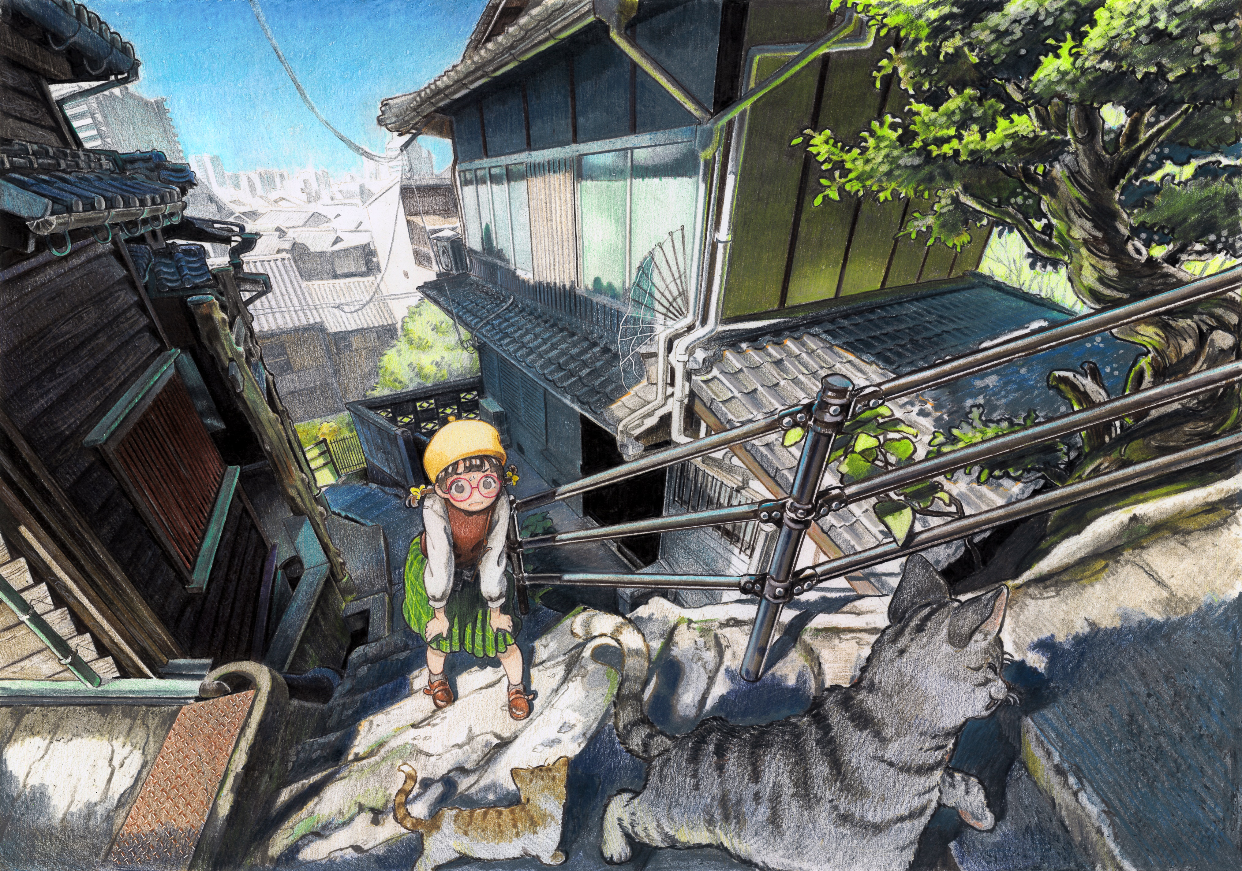1girl absurdres animal black_hair blue_sky bow braid building cat city cityscape colored_pencil_(medium) corrugated_galvanized_iron_sheet day glasses green_skirt hair_bow hands_on_own_knees hat highres leaning_forward long_sleeves looking_at_animal nekojarashi_(yuuga) original pleated_skirt power_lines railing red-framed_eyewear round_eyewear scenery shoes skirt sky solo stairs sweater_vest tile_roof traditional_media tree twin_braids yellow_bow yellow_hat