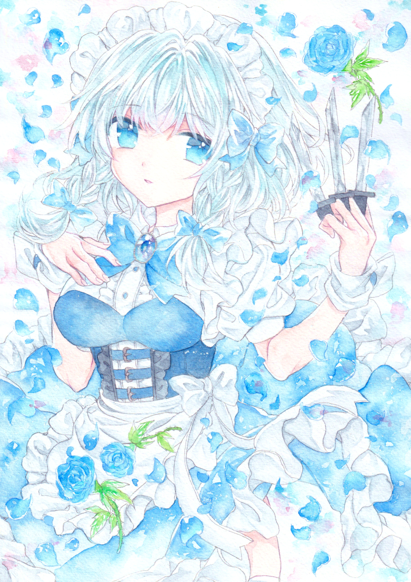 1girl apron blue_bow blue_eyes blue_flower blue_gem blue_petals blue_rose blue_skirt bodice bow braid breasts cowboy_shot flower frilled_shirt frills gem grey_hair hair_bow holding holding_knife izayoi_sakuya knife light_smile maid_apron maid_headdress medium_breasts misoshiru_(user_srue4577) petals puffy_short_sleeves puffy_sleeves rose shirt short_sleeves side_braids skirt solo touhou traditional_media twin_braids white_background white_bow white_shirt white_wrist_cuffs wrist_cuffs
