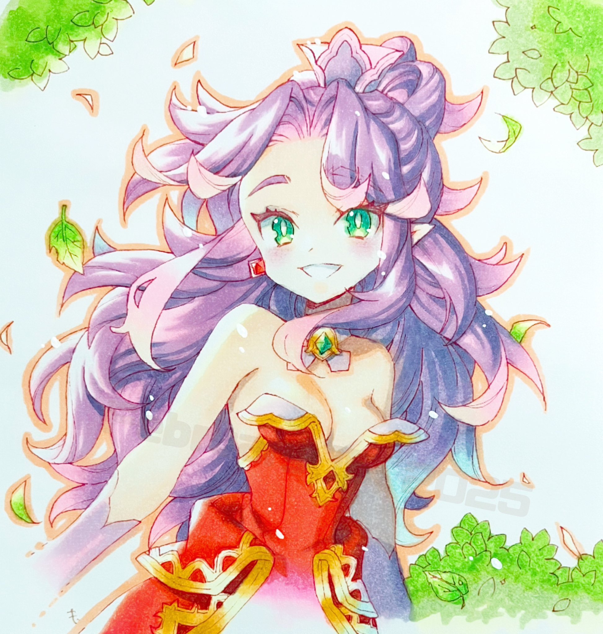 1girl angela_(seiken_densetsu_3) bare_shoulders breasts cleavage cross_tie earrings falling_leaves gloves green_eyes grey_gloves hair_bun hat highres jewelry leaf leotard light_blush long_hair medium_breasts mini_hat motoko_(taom) parted_bangs parted_lips pointy_ears purple_hair red_leotard seiken_densetsu seiken_densetsu_3 showgirl_skirt sidelocks smile solo teeth upper_body