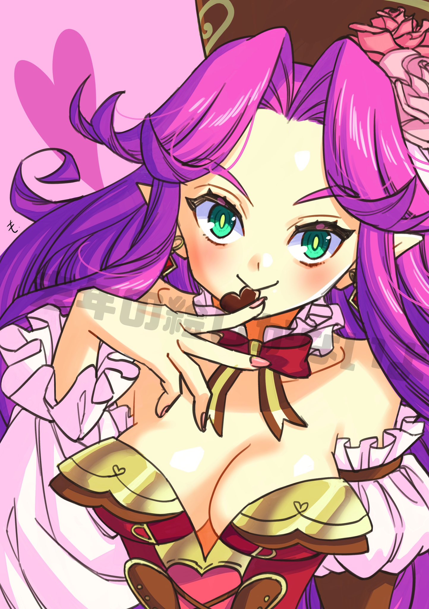 1girl angela_(seiken_densetsu_3) bare_shoulders blush bow bowtie breasts brown_hat candy chocolate chocolate_heart cleavage detached_collar detached_sleeves earrings food frilled_sleeves frills gold_trim green_eyes hat heart heart-shaped_food highres holding holding_chocolate holding_food jewelry leotard looking_at_viewer medium_breasts motoko_(taom) parted_bangs pink_background plunging_neckline pointy_ears purple_hair red_bow red_bowtie red_leotard seiken_densetsu seiken_densetsu_3 sidelocks smile solo striped_bow striped_bowtie striped_clothes upper_body