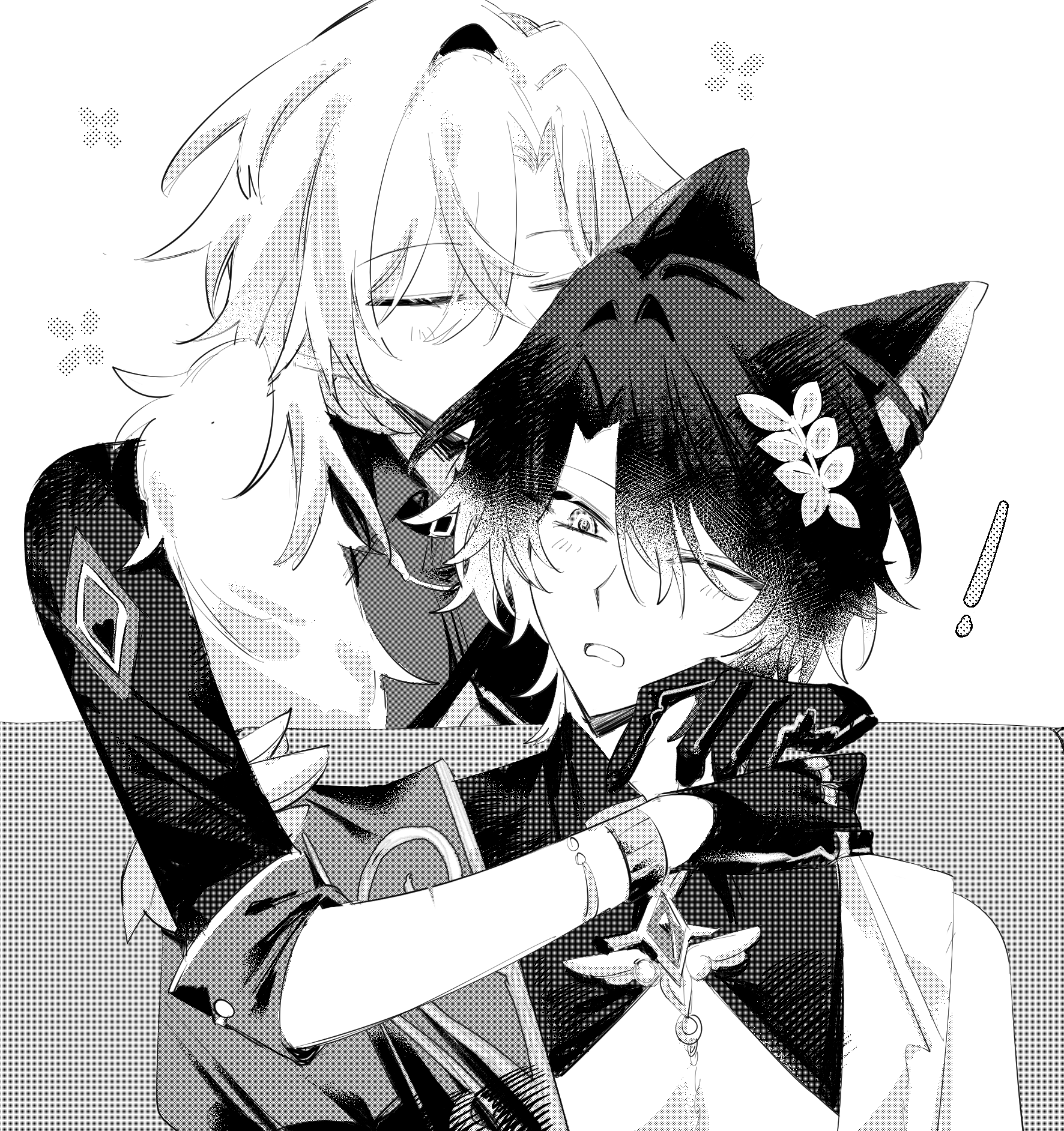 ! 2boys animal_ear_fluff animal_ears aventurine_(honkai:_star_rail) bracelet brooch cat_boy cat_ears closed_eyes collared_shirt commentary curtained_hair diamond-shaped_brooch diamond_(shape) dr._ratio_(honkai:_star_rail) dress_shirt front-to-back fur-trimmed_jacket fur_trim gloves greyscale hair_ornament happy_aura highres honkai:_star_rail honkai_(series) jacket jewelry kemonomimi_mode leaf_hair_ornament light_blush looking_ahead male_focus monochrome multiple_boys multiple_rings one_eye_closed open_mouth ornate_ring raised_eyebrows rementori ring screentones shirt short_hair simple_background sleeve_cuffs smelling smelling_hair surprised three-quarter_sleeves u_u white_background yaoi