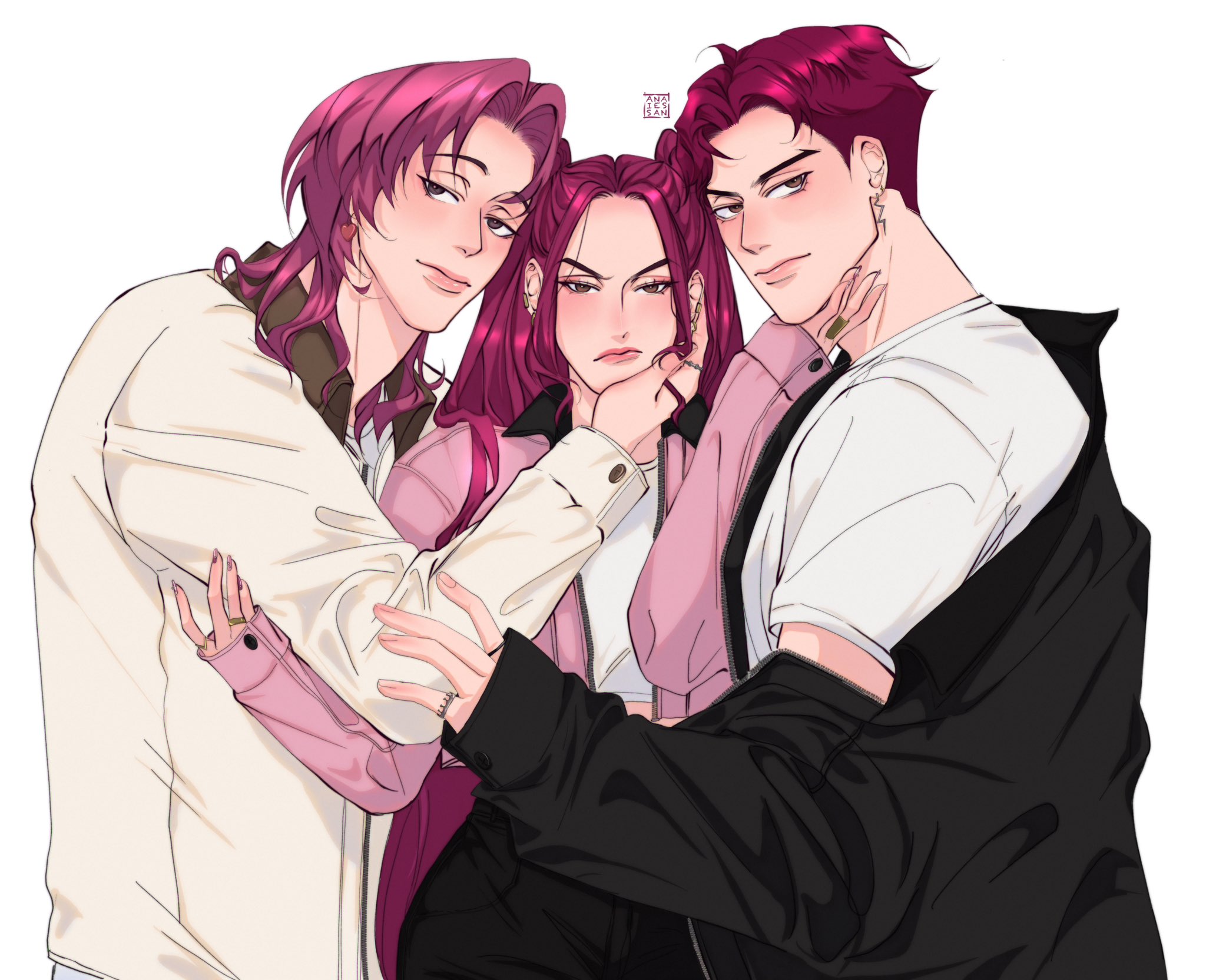 1girl 2boys abby_(kpop_demon_hunters) anaiessan black_jacket brown_eyes commentary earrings hand_on_own_cheek hand_on_own_face highres jacket jewelry kpop_demon_hunters long_hair looking_at_viewer medium_hair mira_(kpop_demon_hunters) multiple_boys pink_hair ring romance_(kpop_demon_hunters) shirt short_hair simple_background twintails upper_body white_background white_shirt
