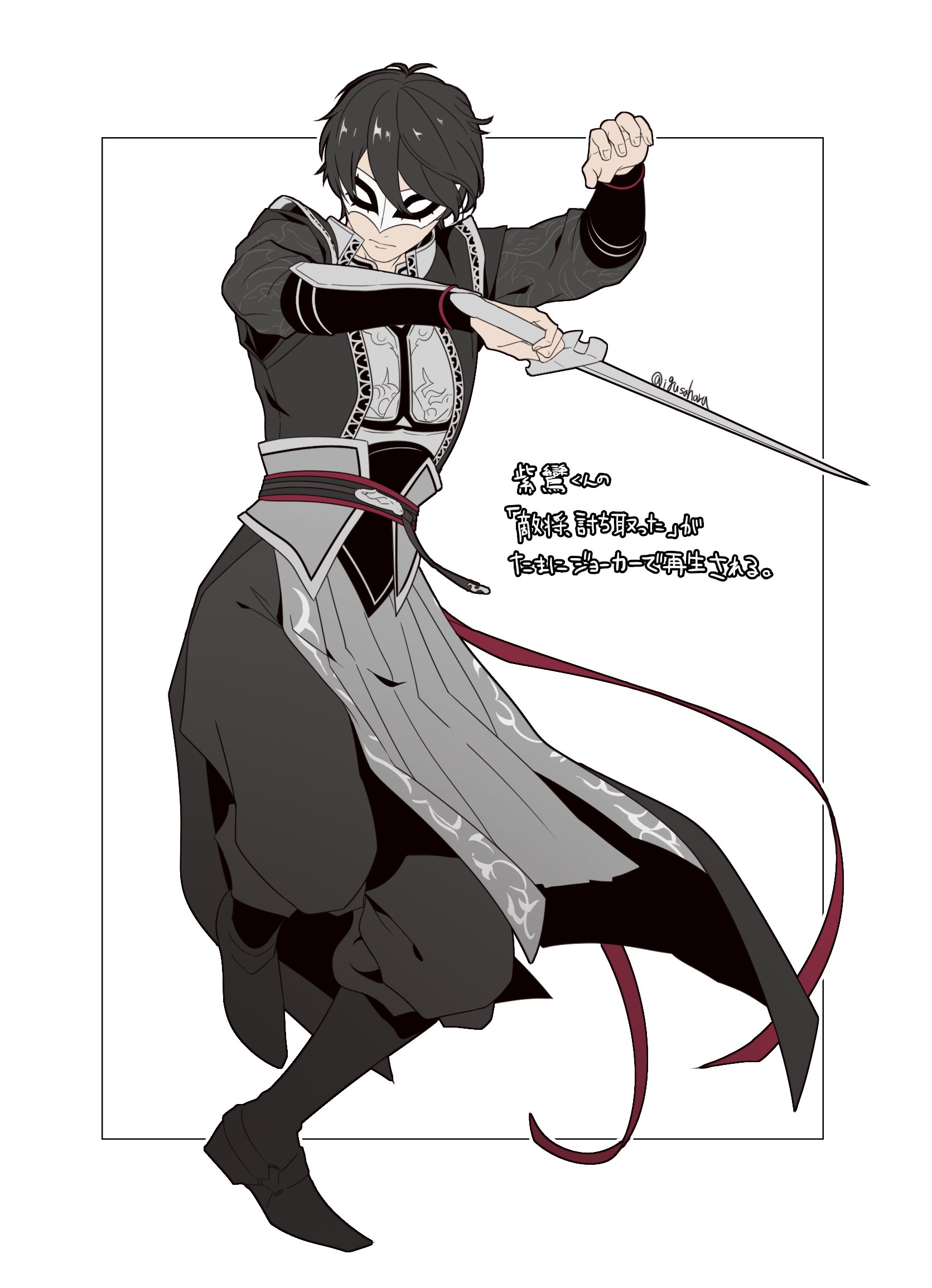 1boy amamiya_ren armor black_boots black_hair black_jacket black_pants boots chinese_armor chinese_clothes closed_mouth eye_mask fighting_stance full_body hair_between_eyes highres holding holding_sword holding_weapon igusaharu jacket jian_(weapon) joker_(persona_5) male_focus mask pants shin_sangoku_musou shin_sangoku_musou_origins short_hair solo sword twitter_username weapon white_background wuxia ziluan_(shin_sangoku_musou)
