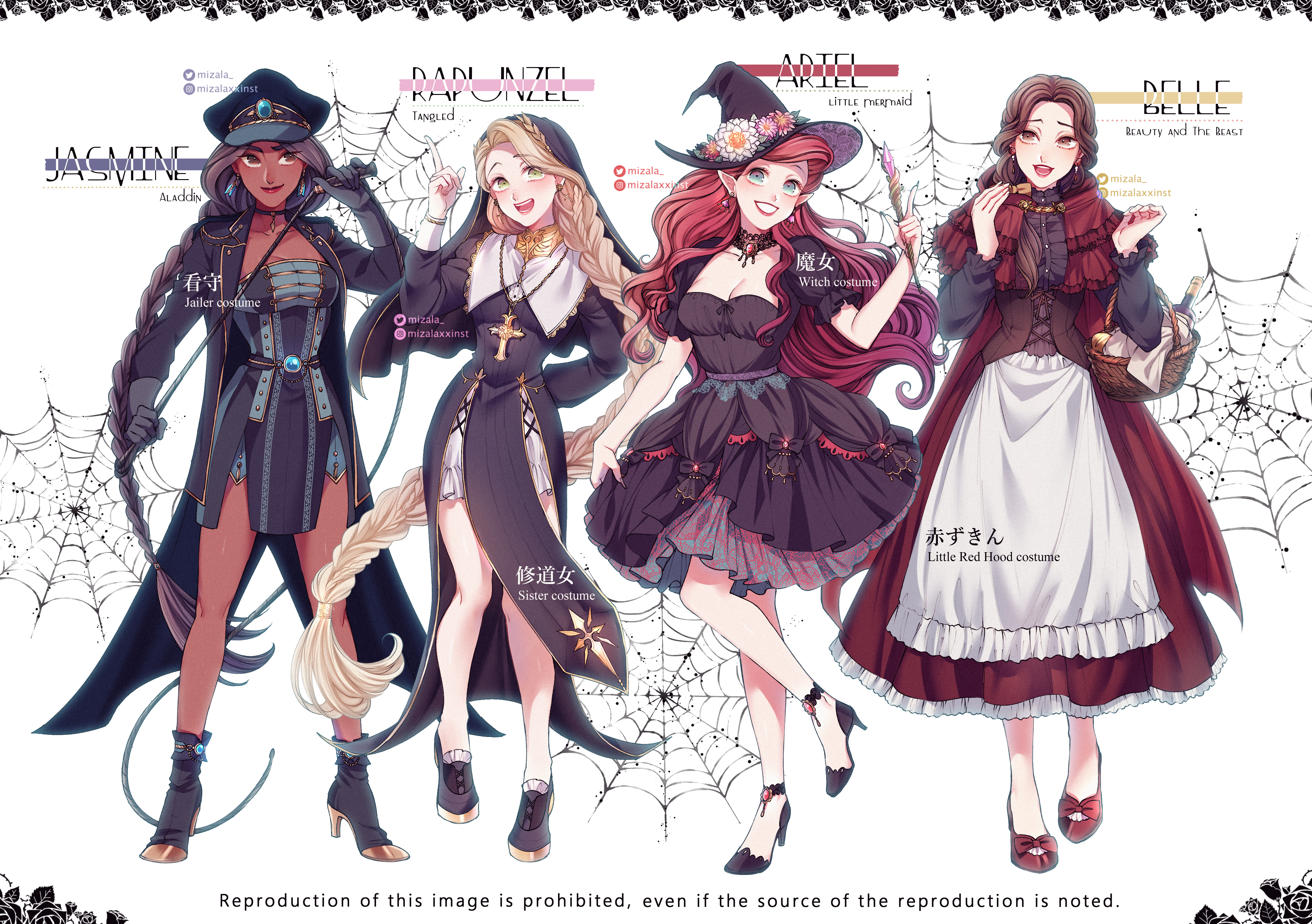 4girls absurdres aladdin_(movie) apron ariel_(disney) beauty_and_the_beast_(disney) belle_(disney) black_dress black_hair black_hat black_jacket black_veil blonde_hair blue_eyes braid brown_corset brown_eyes brown_hair cape commentary_request corset dark-skinned_female dark_skin disney disney_princess dress full_body green_eyes halloween hat highres jacket jasmine_(disney) long_hair long_skirt long_sleeves mizala multiple_girls nun open_clothes open_jacket police_hat rapunzel_(disney) red_cape red_hair red_lips red_shoes red_skirt shoes single_braid skirt smile tangled the_little_mermaid_(disney) veil very_long_hair white_apron witch_hat