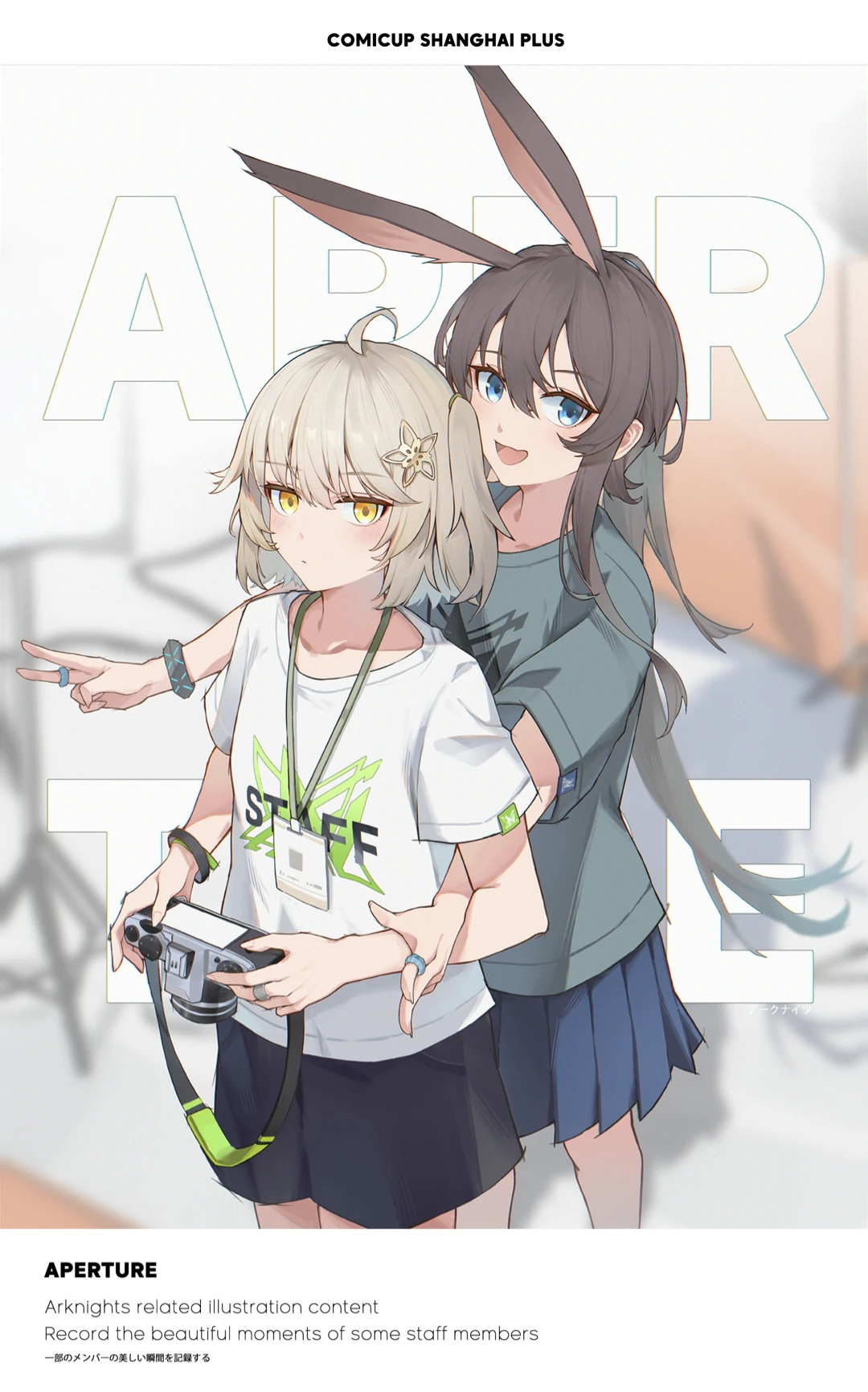 2girls :d ahoge amiya_(arknights) animal_ears arknights behind_another black_shorts blonde_hair blue_eyes blue_skirt brown_hair camera chinese_commentary closed_mouth clothes_writing collarbone commentary commentary_request cowboy_shot english_commentary english_text expressionless green_shirt hair_between_eyes hair_ornament highres holding holding_camera infection_monitor_(arknights) jewelry jia_redian_ruzi_ruzi lanyard long_hair looking_at_viewer miniskirt mixed-language_commentary multiple_girls multiple_rings open_mouth pleated_skirt ring scene_(arknights) shirt short_hair short_sleeves shorts skirt smile standing star_(symbol) star_hair_ornament t-shirt translation_request white_shirt yellow_eyes