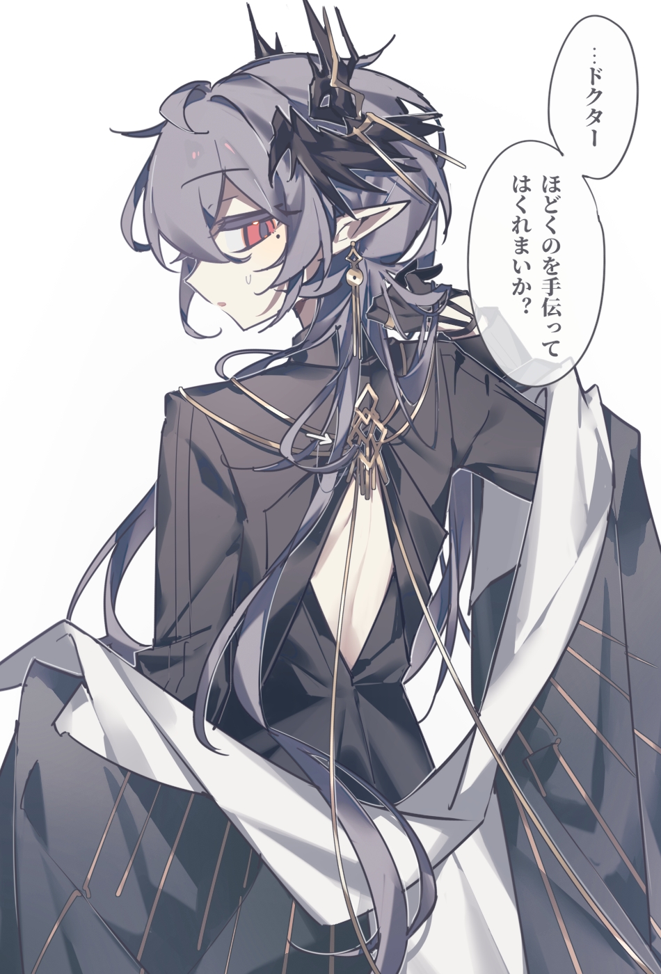 1boy arknights back_cutout black_coat black_shirt clothing_cutout coat commentary earrings english_commentary grey_hair head_wings highres horns jewelry logos_(arknights) logos_(radiant_serenity)_(arknights) long_hair looking_at_viewer male_focus mole mole_under_eye off_shoulder parted_lips pointy_ears red_eyes sen_(5710265) shirt simple_background solo translated very_long_hair white_background wings